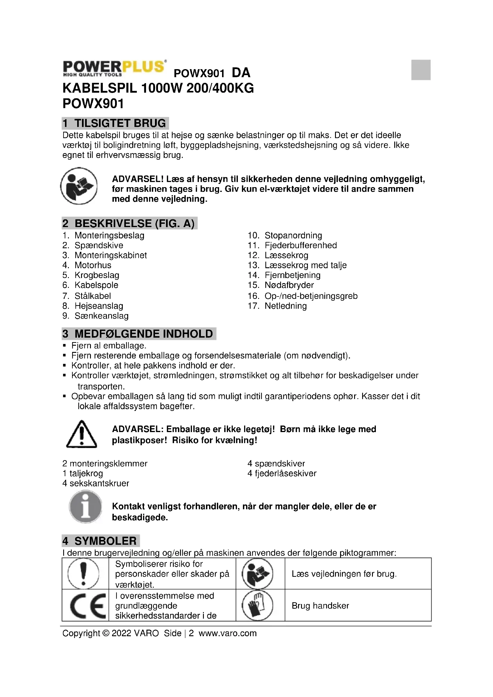POWX901 1 TILSIGTET BRUG Dette kabelspil bruges til at hejse og sænke belastninger op til maks. Det er det ideelle værktøj til boligindretning løft, byggepladshejsning, værkstedshejsning og så videre. Ikke egnet til erhvervsmæssig brug. ADVARSEL! Læs af hensyn til sikkerheden denne vejledning omhyggeligt, før maskinen tages i brug. Giv kun el-værktøjet videre til andre sammen med denne vejledning. 2 BESKRIVELSE (FIG. A)
