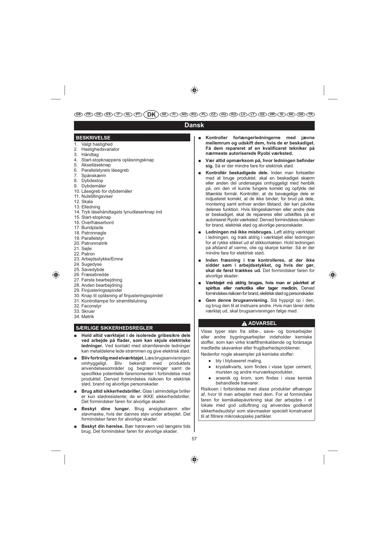 nøgle på patronmøtrikken og drejes mod venstre for at løsne møtrikken. ADVARSEL Formålet med det dobbelt-isolerede system er at beskytte brugeren mod elektrisk stød som følge af brud på produktets interne isolering. De sædvanlige forsigtighedsregler skal stadig overholdes for at undgå elektrisk stød. ADVARSEL Hvis fræseindsatsen skal skiftes kort efter, overfræseren har været brugt, må fræseindsatsen og patronen ikke berøres. Man kan nemlig brænde ngrene, fordi delene er blevet meget varme under fræsningen. Anvend altid den medleverede nøgle. Vigtigt! Servicering af et produkt med dobbelt-isolering kræver ekstrem forsigtighed og kendskab til systemet og bør kun udføres af kvali cerede serviceteknikere. Det tilrådes at aevere værktøjet til reparation på nærmeste autoriserede Ryobi serviceværksted.