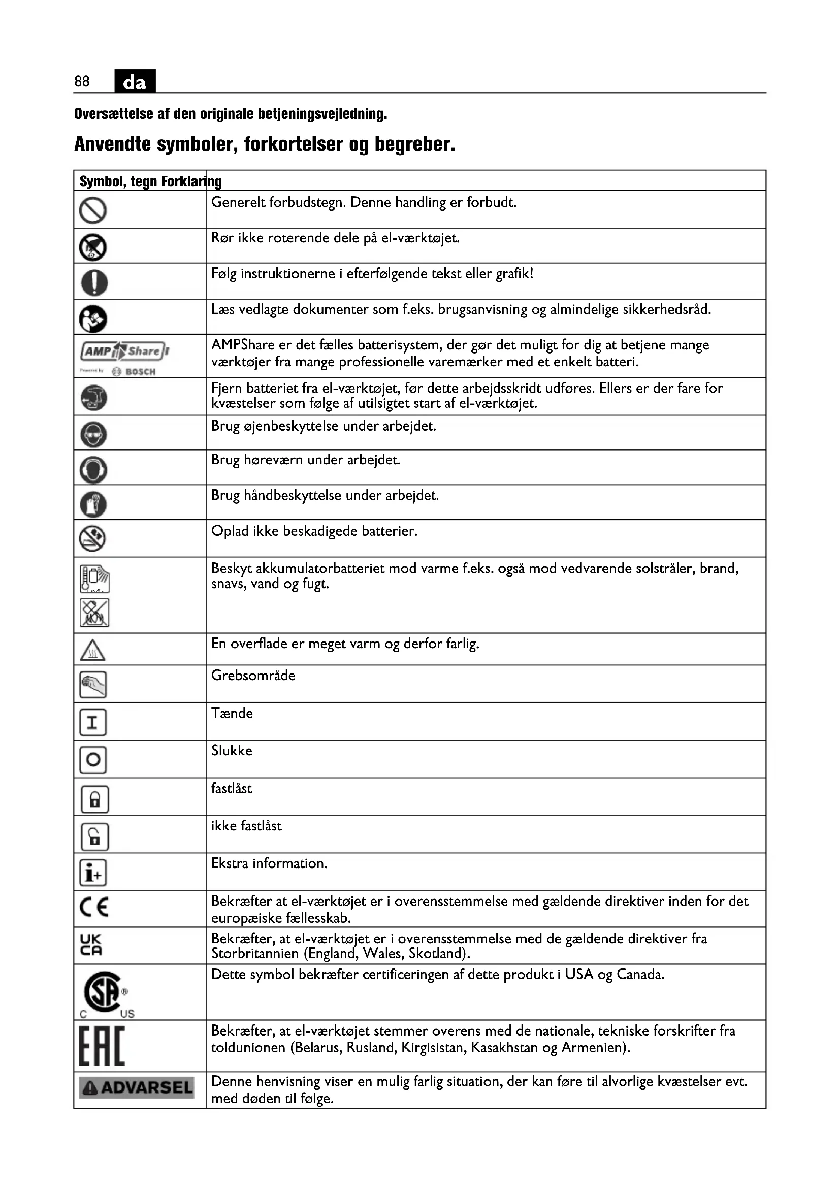 Oversættelse af den originale betjeningsvejledning. Anvendte symboler, forkortelser og begreber. Symbol, tegn Forklaring Generelt forbudstegn. Denne handling er forbudt. Rør ikke roterende dele på el-værktøjet. Følg instruktionerne i efterfølgende tekst eller grafik! Læs vedlagte dokumenter som f.eks. brugsanvisning og almindelige sikkerhedsråd. AMPShare er det fælles batterisystem, der gør det muligt for dig at betjene mange værktøjer fra mange professionelle varemærker med et enkelt batteri. Fjern batteriet fra el-værktøjet, før dette arbejdsskridt udføres. Ellers er der fare for kvæstelser som følge af utilsigtet start af el-værktøjet. Brug øjenbeskyttelse under arbejdet. Brug høreværn under arbejdet. Brug håndbeskyttelse under arbejdet. Oplad ikke beskadigede batterier. Beskyt akkumulatorbatteriet mod varme f.eks. også mod vedvarende solstråler, brand, snavs, vand og fugt. En overflade er meget varm og derfor farlig. Grebsområde Tænde Slukke fastlåst ikke fastlåst Ekstra information. Bekræfter at el-værktøjet er i overensstemmelse med gældende direktiver inden for det europæiske fællesskab. Bekræfter, at el-værktøjet er i overensstemmelse med de gældende direktiver fra Storbritannien (England, Wales, Skotland). Dette symbol bekræfter certificeringen af dette produkt i USA og Canada. Bekræfter, at el-værktøjet stemmer overens med de nationale, tekniske forskrifter fra toldunionen (Belarus, Rusland, Kirgisistan, Kasakhstan og Armenien). Denne henvisning viser en mulig farlig situation, der kan føre til alvorlige kvæstelser evt. med døden til følge. max.50°C89