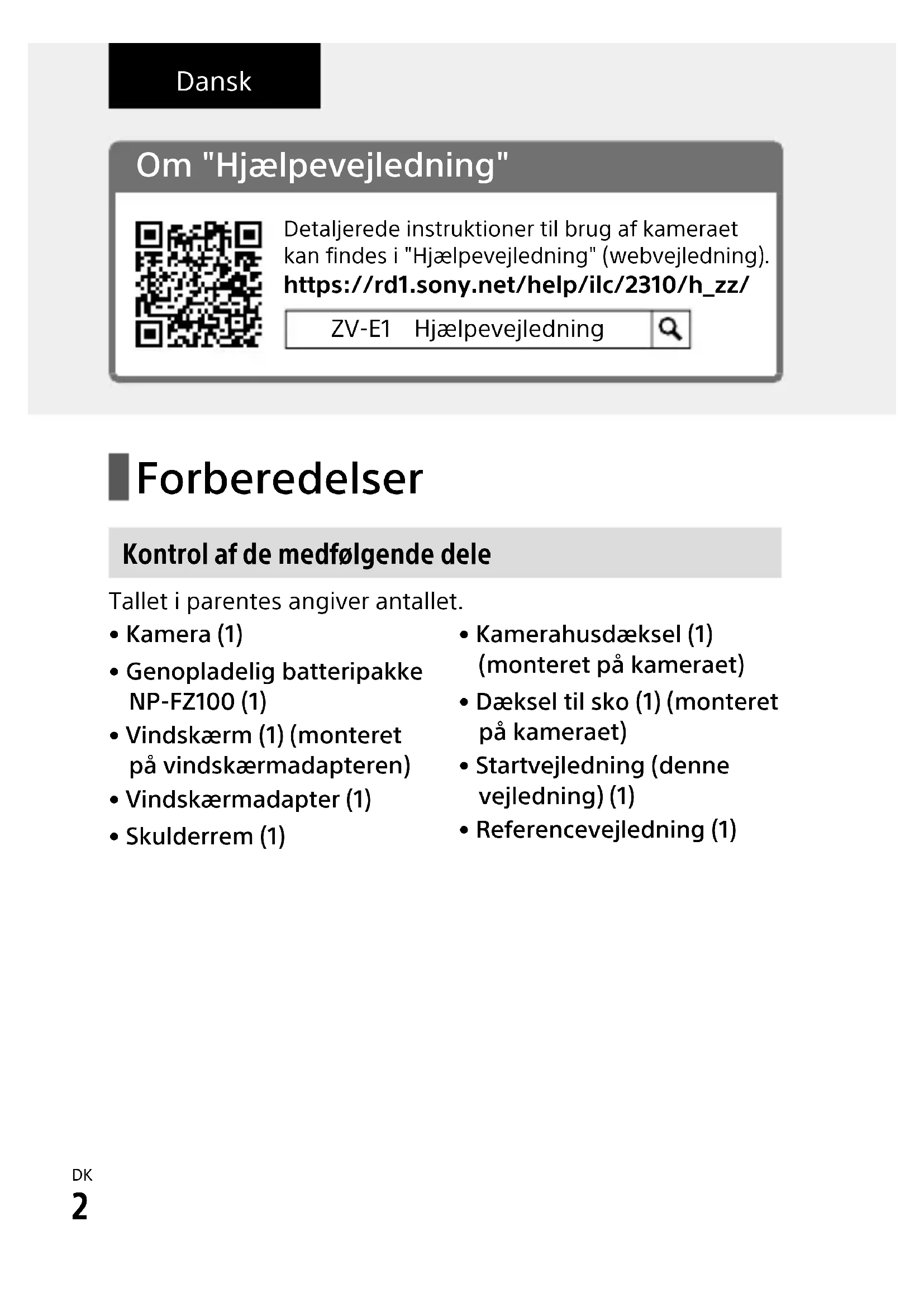 Om "Hjælpevejledning" Detaljerede instruktioner til brug af kameraet kan findes i "Hjælpevejledning" (webvejledning).https://rd1.sony.net/help/ilc/2310/h_zz/ZV-E1 Hjælpevejledning Dansk Forberedelser Kontrol af de medfølgende dele Tallet i parentes angiver antallet.• Kamera (1)• Genopladelig batteripakke NP-FZ100 (1)• Vindskærm (1) (monteret på vindskærmadapteren)• Vindskærmadapter (1)• Skulderrem (1)• Kamerahusdæksel (1) (monteret på kameraet)• Dæksel til sko (1) (monteret på kameraet)• Startvejledning (denne vejledning) (1)• Referencevejledning (1)DK