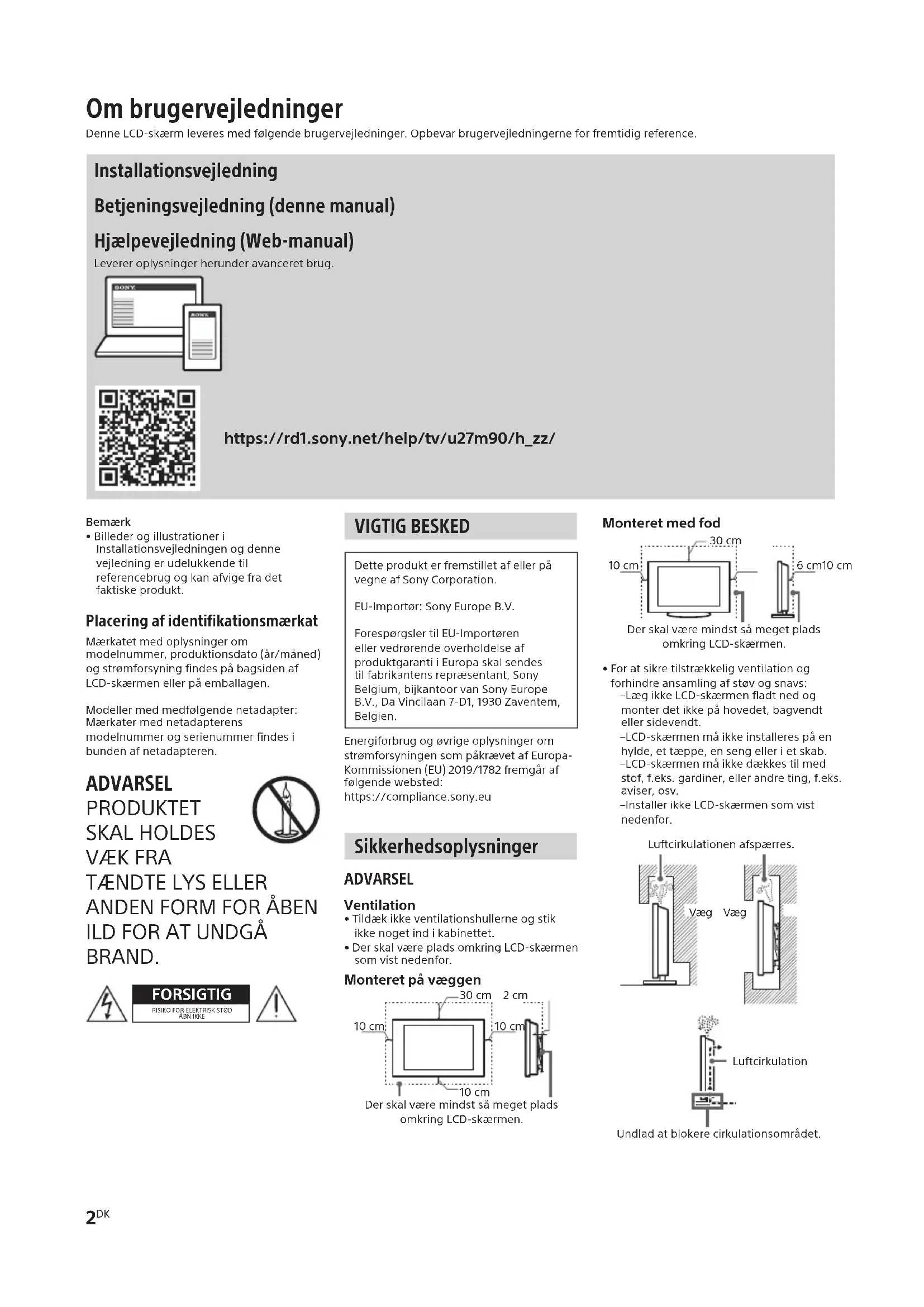 VIGTIG BESKED DetteprodukterfremstilletafellerpåvegneafSonyCorporation.EU-Importør:SonyEuropeB.V.ForespørgslertilEU-ImportørenellervedrørendeoverholdelseafproduktgarantiiEuropaskalsendestilfabrikantensrepræsentant,SonyBelgium,bijkantoorvanSonyEuropeB.V.,DaVincilaan7-D1,1930Zaventem,Belgien.EnergiforbrugogøvrigeoplysningeromstrømforsyningensompåkrævetafEuropa-Kommissionen(EU)2019/1782fremgåraffølgendewebsted:https://compliance.sony.eu Sikkerhedsoplysninger ADVARSEL Ventilation•Tildækikkeventilationshullerneogstikikkenogetindikabinettet.•DerskalværepladsomkringLCD-skærmensomvistnedenfor.Monteret på væggenDerskalværemindstsåmegetpladsomkringLCD-skærmen.10cm30cm 2cm10cm10cmMonteret med fodDerskalværemindstsåmegetpladsomkringLCD-skærmen.6cm10cm30cm10cm•Foratsikretilstrækkeligventilationogforhindreansamlingafstøvogsnavs:– LægikkeLCD-skærmenfladtnedogmonterdetikkepåhovedet,bagvendtellersidevendt.– LCD-skærmenmåikkeinstallerespåenhylde,ettæppe,ensengellerietskab.– LCD-skærmenmåikkedækkestilmedstof,f.eks.gardiner,ellerandreting,f.eks.aviser,osv.– InstallerikkeLCD-skærmensomvistnedenfor.Luftcirkulationenafspærres.Væg VægLuftcirkulationUndladatblokerecirkulationsområdet. Om brugervejledninger DenneLCD-skærmleveresmedfølgendebrugervejledninger.Opbevarbrugervejledningerneforfremtidigreference. Installationsvejledning Betjeningsvejledning (denne manual) Hjælpevejledning (Web-manual) Levereroplysningerherunderavanceretbrug.https://rd1.sony.net/help/tv/u27m90/h_zz/SDM-U27M90 5-042-069-31(2)