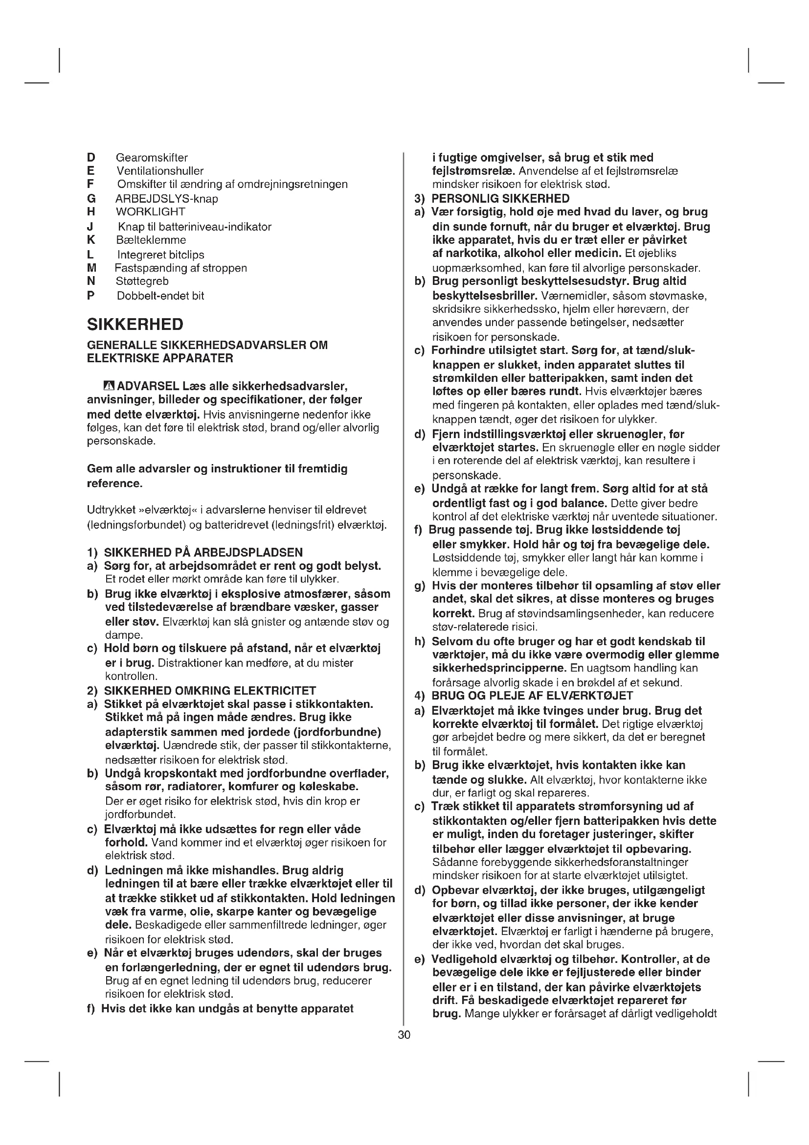 a) Elværktøjet må ikke tvinges under brug. Brug det korrekte elværktøj til formålet. Det rigtige elværktøj gør arbejdet bedre og mere sikkert, da det er beregnet til formålet. b) Brug ikke elværktøjet, hvis kontakten ikke kan tænde og slukke. Alt elværktøj, hvor kontakterne ikke dur, er farligt og skal repareres. c) Træk stikket til apparatets strømforsyning ud af stikkontakten og/eller fjern batteripakken hvis dette er muligt, inden du foretager justeringer, skifter tilbehør eller lægger elværktøjet til opbevaring. Sådanne forebyggende sikkerhedsforanstaltninger mindsker risikoen for at starte elværktøjet utilsigtet. d) Opbevar elværktøj, der ikke bruges, utilgængeligt for børn, og tillad ikke personer, der ikke kender elværktøjet eller disse anvisninger, at bruge elværktøjet. Elværktøj er farligt i hænderne på brugere, der ikke ved, hvordan det skal bruges. e) Vedligehold elværktøj og tilbehør. Kontroller, at de bevægelige dele ikke er fejljusterede eller binder eller er i en tilstand, der kan påvirke elværktøjets drift. Få beskadigede elværktøjet repareret før brug. Mange ulykker er forårsaget af dårligt vedligeholdt D Gearomskifter E Ventilationshuller F Omskifter til ændring af omdrejningsretningen G ARBEJDSLYS-knap H WORKLIGHT