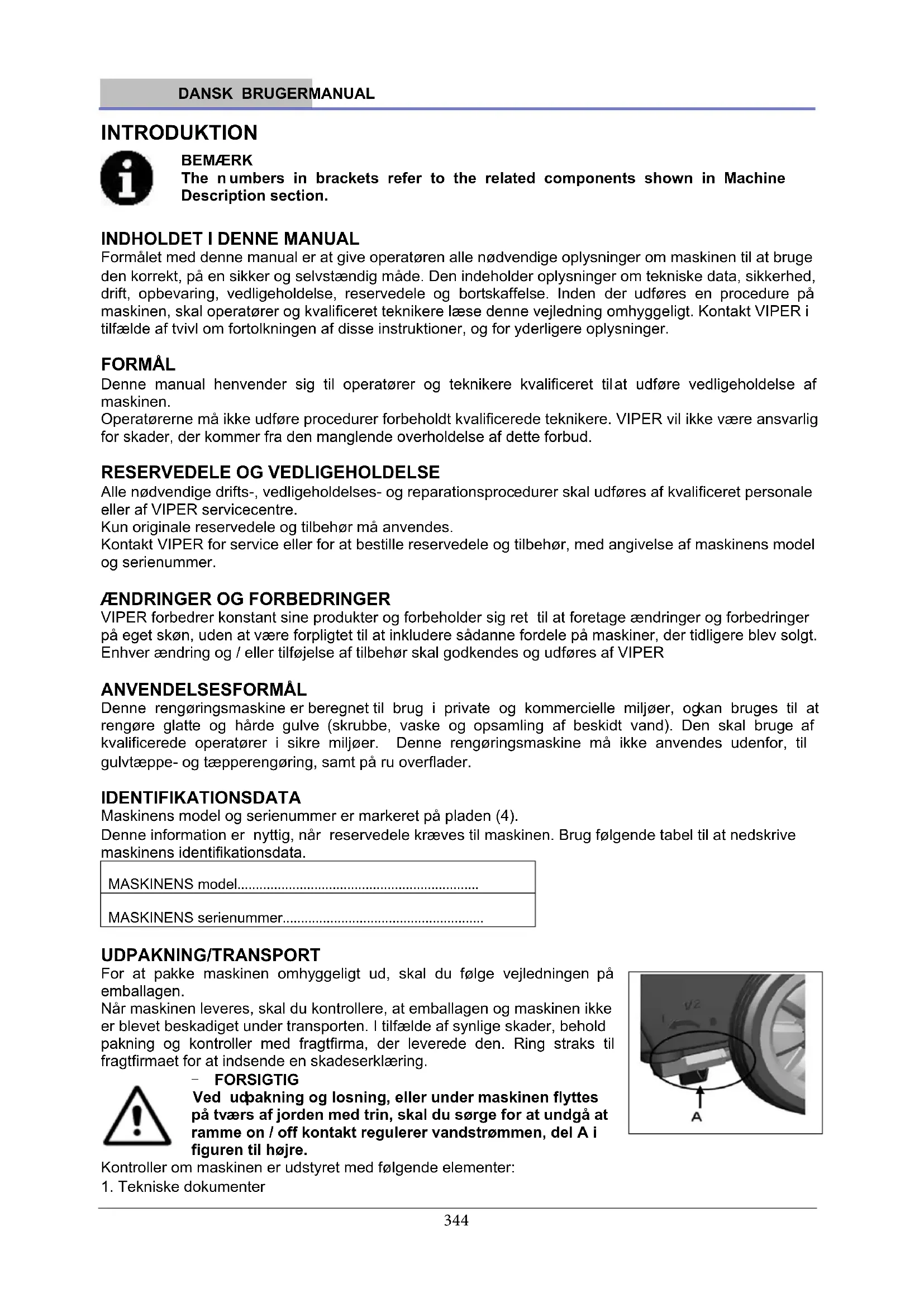 VIPER forbedrer konstant sine produkter og forbeholder sig ret til at foretage ændringer og forbedringer på eget skøn, uden at være forpligtet til at inkludere sådanne fordele på maskiner, der tidligere blev solgt. Enhver ændring og / eller tilføjelse af tilbehør skal godkendes og udføres af VIPER ANVENDELSESFORMÅL Denne rengøringsmaskine er beregnet til brug i private og kommercielle miljøer, og kan bruges til at rengøre glatte og hårde gulve (skrubbe, vaske og opsamling af beskidt vand). Den skal bruge af kvalificerede operatører i sikre miljøer. Denne rengøringsmaskine må ikke anvendes udenfor, til gulvtæppe- og tæpperengøring, samt på ru overflader. IDENTIFIKATIONSDATA Maskinens model og serienummer er markeret på pladen (4). Denne information er nyttig, når reservedele kræves til maskinen. Brug følgende tabel til at nedskrive maskinens identifikationsdata. MASKINENS model.................................................................. MASKINENS serienummer....................................................... UDPAKNING/TRANSPORT For at pakke maskinen omhyggeligt ud, skal du følge vejledningen