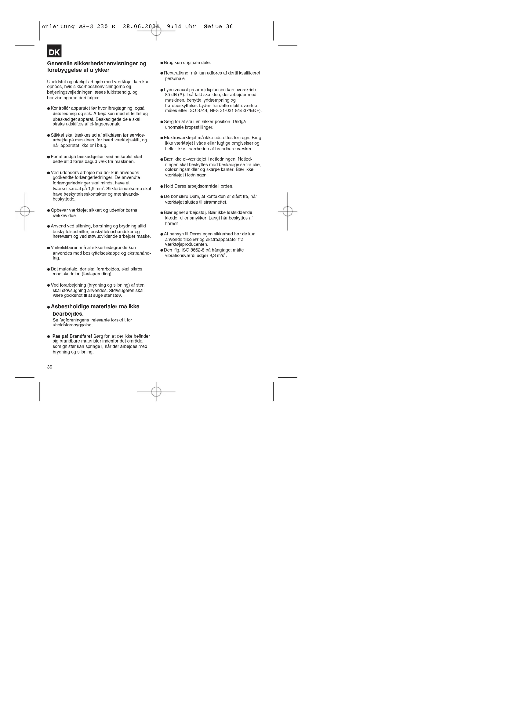 Lyndveauet pa arbeitsdpsladen kan overskride 85 dB (A).I salf kal den, der arbeitder med maskinen, benyte lyddemping og horebskyttele. Lynd ra defte aktelvektroktj moles after ISO 3744,NFS 31-031 84/537/EOF).