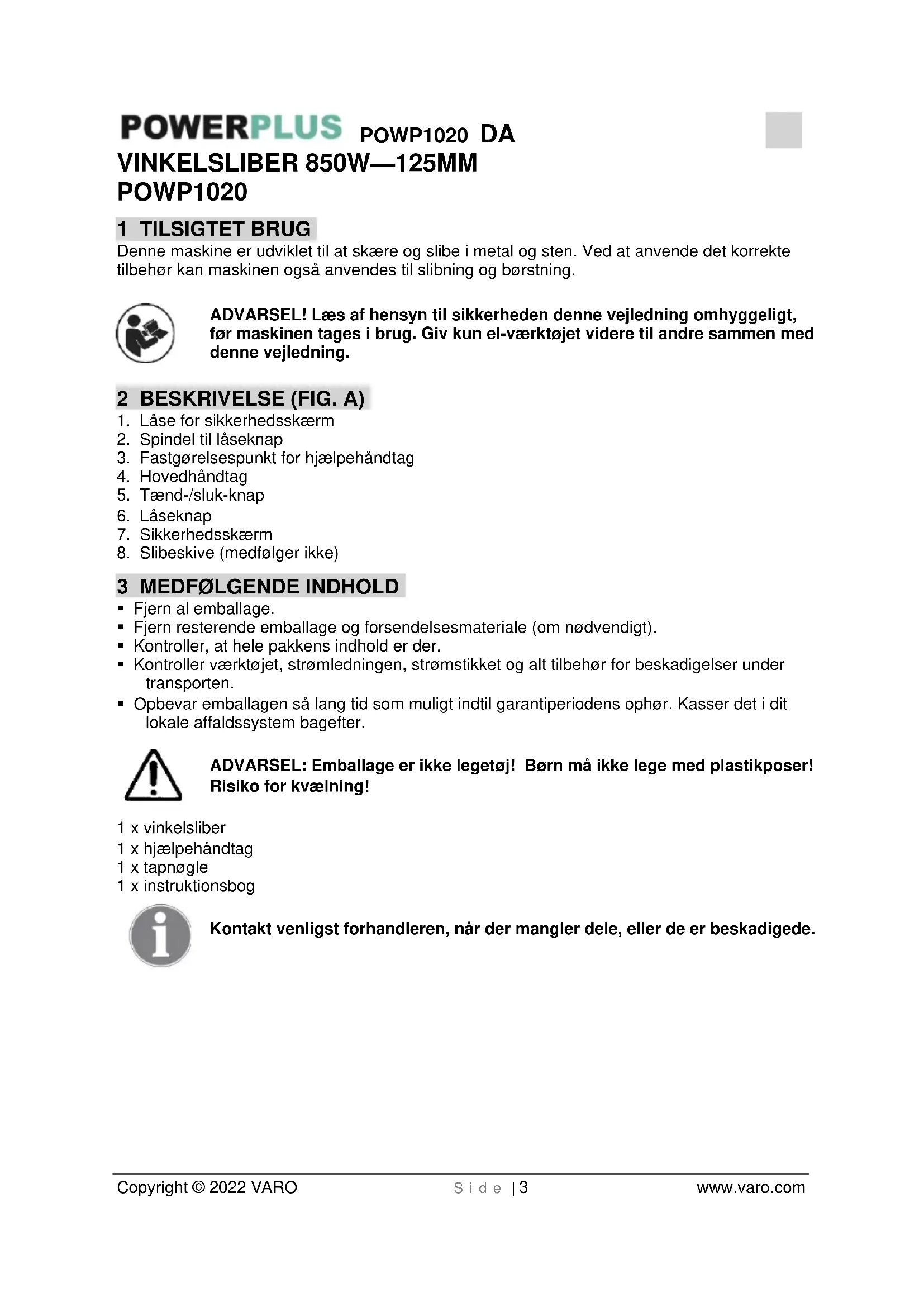 - Opbevar emballagen så lang tid som muligt indtil garantiperiodens ophør. Kasser det i dit lokale affaldssystem bagefter. ADVARSEL: Emballage er ikke legetøj! Børn må ikke lege med plastikposer! Risiko for kvælning! 1 x vinkelsliber 1 x hjælpehåndtag 1 x tapnøgle 1 x instruktionsbog Kontakt venligst forhandleren, når der mangler dele, eller de er beskadigede.POWP1020 DA Copyright © 2022 VARO S i d e | 4 www.varo.com 4 SYMBOLER I denne brugervejledning og/eller på maskinen anvendes der følgende piktogrammer:
