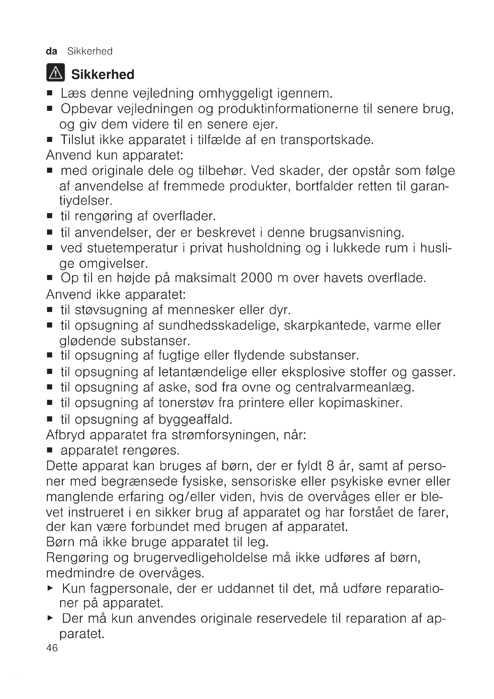 Sikkerhed ¡ Læs denne vejledning omhyggeligt igennem. ¡ Opbevar vejledningen og produktinformationerne til senere brug, og giv dem videre til en senere ejer. ¡ Tilslut ikke apparatet i tilfælde af en transportskade. Anvend kun apparatet: ¡ med originale dele og tilbehør. Ved skader, der opstår som følge af anvendelse af fremmede produkter, bortfalder retten til garan- tiydelser. ¡ til rengøring af overflader. ¡ til anvendelser, der er beskrevet i denne brugsanvisning. ¡ ved stuetemperatur i privat husholdning og i lukkede rum i husli- ge omgivelser. ¡ Op til en højde på maksimalt 2000m over havets overflade. Anvend ikke apparatet: ¡ til støvsugning af mennesker eller dyr. ¡ til opsugning af sundhedsskadelige, skarpkantede, varme eller glødende substanser. ¡ til opsugning af fugtige eller flydende substanser. ¡ til opsugning af letantændelige eller eksplosive stoffer og gasser. ¡ til opsugning af aske, sod fra ovne og centralvarmeanlæg. ¡ til opsugning af tonerstøv fra printere eller kopimaskiner. ¡ til opsugning af byggeaffald. Afbryd apparatet fra strømforsyningen, når: ¡ apparatet rengøres. Dette apparat kan bruges af børn, der er fyldt 8 år, samt af perso- ner med begrænsede fysiske, sensoriske eller psykiske evner eller manglende erfaring og/eller viden, hvis de overvåges eller er ble- vet instrueret i en sikker brug af apparatet og har forstået de farer, der kan være forbundet med brugen af apparatet. Børn må ikke bruge apparatet til leg. Rengøring og brugervedligeholdelse må ikke udføres af børn, medmindre de overvåges. ▶ Kun fagpersonale, der er uddannet til det, må udføre reparatio- ner på apparatet. ▶ Der må kun anvendes originale reservedele til reparation af ap- paratet.Sikkerhed da
