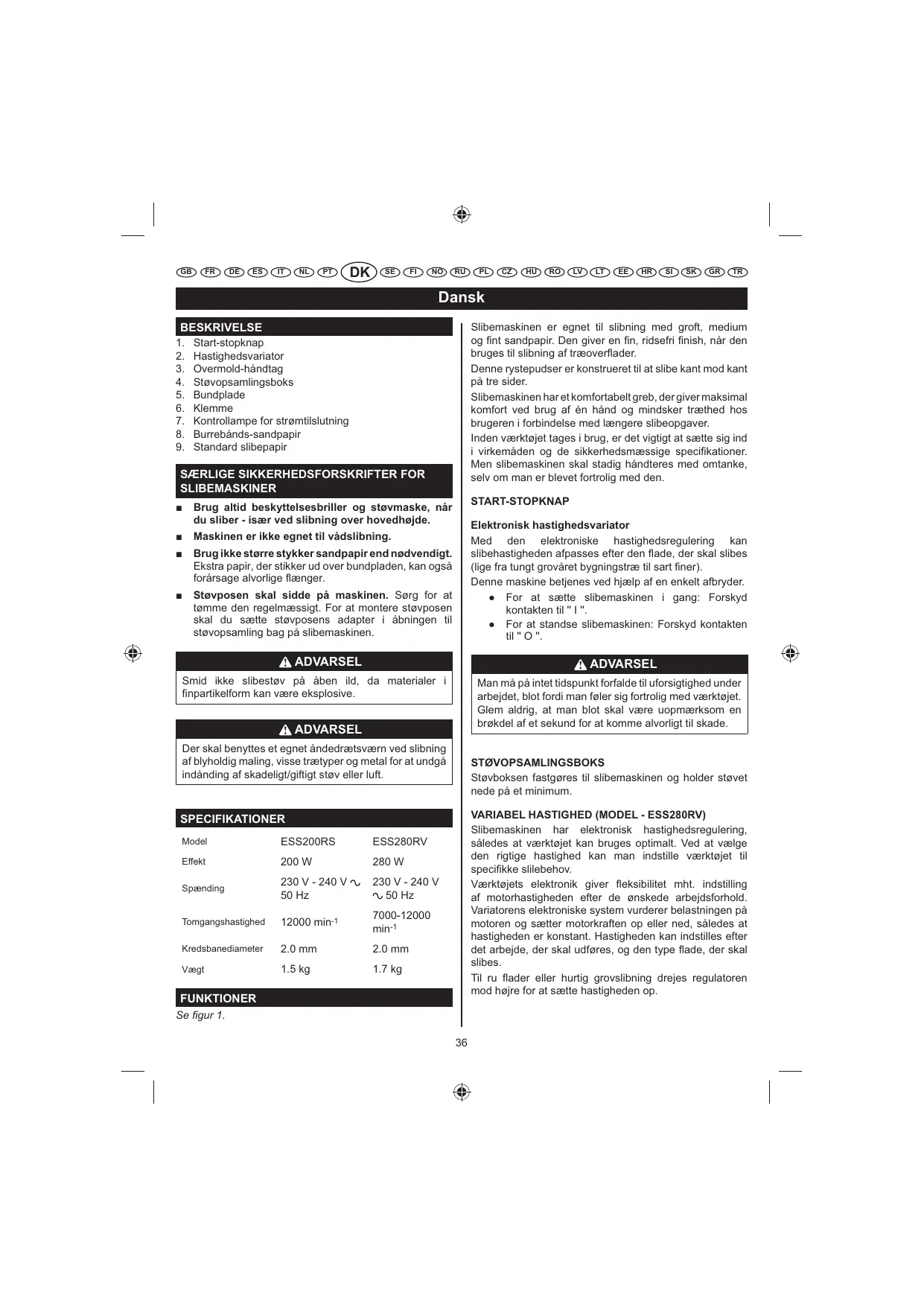 Støvposen skal sidde på maskinen. Sørg for at tømme den regelmæssigt. For at montere støvposen skal du sætte støvposens adapter i åbningen til støvopsamling bag på slibemaskinen. START-STOPKNAP Elektronisk hastighedsvariator Med den elektroniske hastighedsregulering kan slibehastigheden afpasses efter den Åade, der skal slibes (lige fra tungt grovåret bygningstræ til sart Àner). Denne maskine betjenes ved hjælp af en enkelt afbryder. È For at sætte slibemaskinen i gang: Forskyd kontakten til '' I ''. È For at standse slibemaskinen: Forskyd kontakten til '' O ''. ADVARSEL ADVARSEL Smid ikke slibestøv på åben ild, da materialer i Ànpartikelform kan være eksplosive. Man må på intet tidspunkt forfalde til uforsigtighed under arbejdet, blot fordi man føler sig fortrolig med værktøjet. Glem aldrig, at man blot skal være uopmærksom en brøkdel af et sekund for at komme alvorligt til skade. ADVARSEL Der skal benyttes et egnet åndedrætsværn ved slibning af blyholdig maling, visse trætyper og metal for at undgå indånding af skadeligt/giftigt støv eller luft. STØVOPSAMLINGSBOKS Støvboksen fastgøres til slibemaskinen og holder støvet nede på et minimum. VARIABEL HASTIGHED (MODEL - ESS280RV) Slibemaskinen har elektronisk hastighedsregulering, således at værktøjet kan bruges optimalt. Ved at vælge den rigtige hastighed kan man indstille værktøjet til speciÀkke slilebehov. Værktøjets elektronik giver Åeksibilitet mht. indstilling af motorhastigheden efter de ønskede arbejdsforhold. Variatorens elektroniske system vurderer belastningen på motoren og sætter motorkraften op eller ned, således at hastigheden er konstant. Hastigheden kan indstilles efter det arbejde, der skal udføres, og den type Åade, der skal slibes. Til ru Åader eller hurtig grovslibning drejes regulatoren mod højre for at sætte hastigheden op. SPECIFIKATIONER Model ESS200RS ESS280RV Effekt 200 W 280 W Spænding 230 V - 240 V 50 Hz 230 V - 240 V 50 Hz Tomgangshastighed 12000 min-1 7000-12000 min-1 Kredsbanediameter