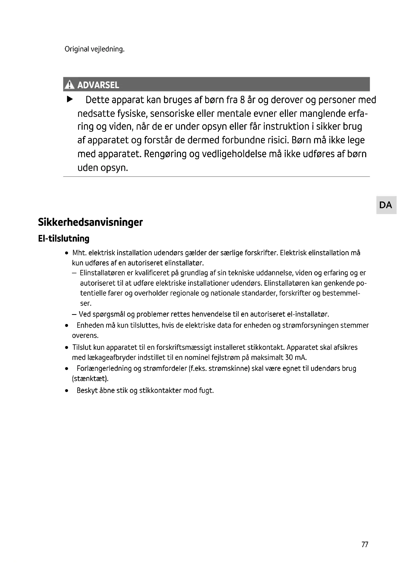 ADVARSEL ADVARSEL Dette apparat kan bruges af børn fra 8 år og derover og personer med nedsatte fysiske, sensoriske eller mentale evner eller manglende erfa- ring og viden, når de er under opsyn eller får instruktion i sikker brug af apparatet og forstår de dermed forbundne risici. Børn må ikke lege med apparatet. Rengøring og vedligeholdelse må ikke udføres af børn uden opsyn. Sikkerhedsanvisninger El-tilslutning Mht. elektrisk installation udendørs gælder der særlige forskrifter. Elektrisk elinstallation må kun udføres af en autoriseret elinstallatør. – Elinstallatøren er kvalificeret på grundlag af sin tekniske uddannelse, viden og erfaring og er autoriseret til at udføre elektriske installationer udendørs. Elinstallatøren kan genkende po- tentielle farer og overholder regionale og nationale standarder, forskrifter og bestemmel- ser. – Ved spørgsmål og problemer rettes henvendelse til en autoriseret el-installatør. Enheden må kun tilsluttes, hvis de elektriske data for enheden og strømforsyningen stemmer overens. Tilslut kun apparatet til en forskriftsmæssigt installeret stikkontakt. Apparatet skal afsikres med lækageafbryder indstillet til en nominel fejlstrøm på maksimalt 30 mA. Forlængerledning og strømfordeler (f.eks. strømskinne) skal være egnet til udendørs brug (stænktæt). Beskyt åbne stik og stikkontakter mod fugt.78 Sikker drift Anvend ikke apparatet, hvis de elektriske ledninger eller huset er beskadiget. En beskadiget nettilslutningsledning skal straks udskiftes af OASE, en autoriseret kundeser- vice eller en kvalificeret elinstallatør for at undgå farer på grund af stød. Bær eller træk ikke apparatet i den elektriske ledning. Før ledninger, så de er beskyttet mod beskadigelser, og så ingen kan falde over dem. Foretag aldrig tekniske ændringer på apparatet. Der må kun udføres arbejde på enheden, som er beskrevet i denne vejledning. Brug kun originale reservedele og originalt tilbehør. Formålsbestemt anvendelse Brug kun det produkt, der er beskrevet i denne vejledning, som følger: Automatisk til- og frakobling af en vandpumpe (trykpumpe) ved vandaftapning via en tilsluttet forbruger. Under overholdelse af de tekniske specifikationer. (→ Tekniske data) Der gælder følgende restriktioner for apparatet: Egner sig ikke til pumper med integreret automatisk styring. Må ikke sluttes til drikkevandsforsyningen. Ikke egnet til drikkevand. Må ikke anvendes til erhvervs- eller industrimæssige formål. Må ikke sættes i forbindelse med kemikalier, levnedsmidler, let brændbare eller eksplosive stoffer.DA