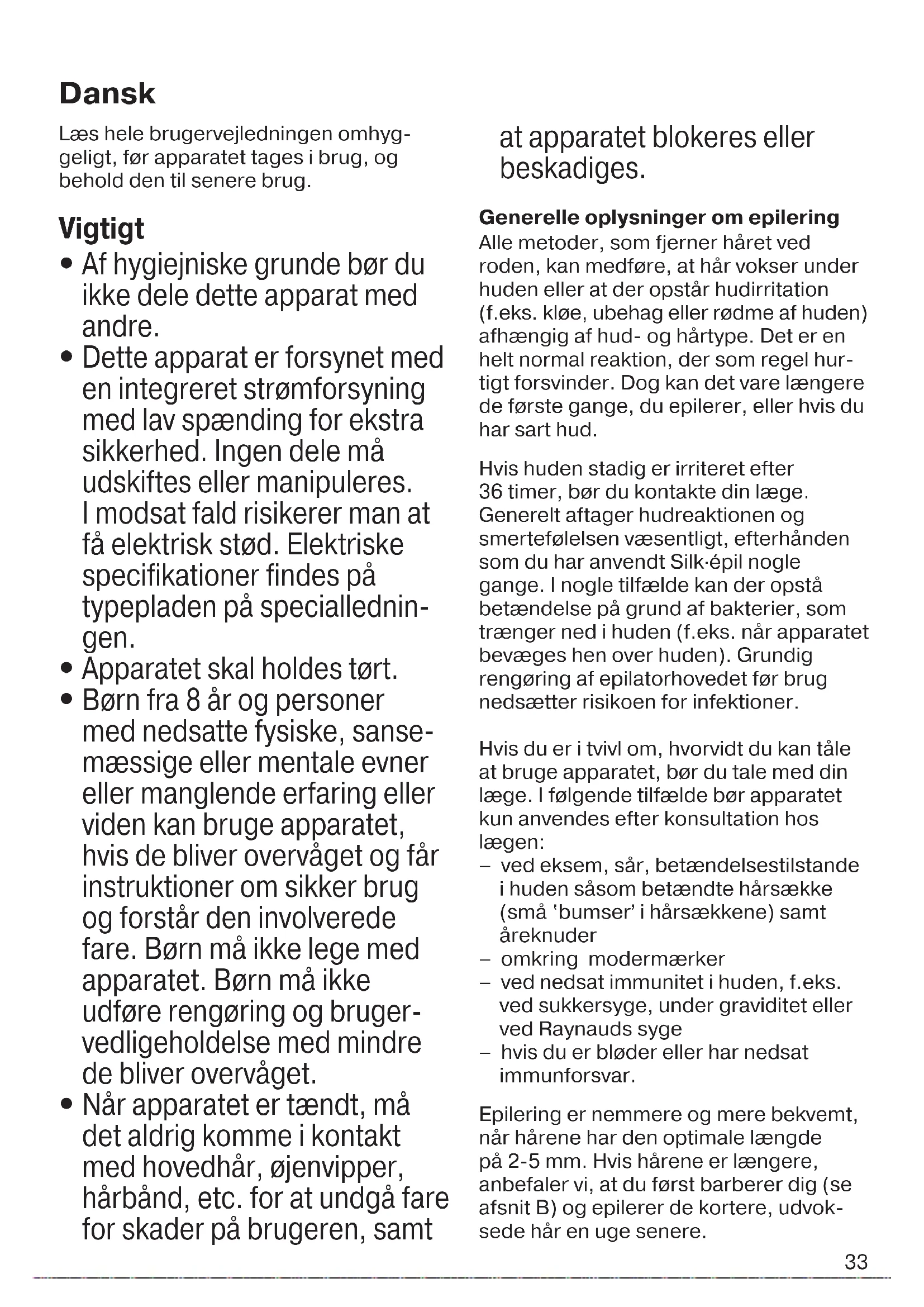 Når apparatet er tændt, må det aldrig komme i kontakt med hovedhår, øjenvipper, hårbånd, etc. for at undgå fare for skader på brugeren, samt at apparatet blokeres eller beskadiges. Generelle oplysninger om epilering Alle metoder, som fjerner håret ved roden, kan medføre, at hår vokser under huden eller at der opstår hudirritation (f.eks. kløe, ubehag eller rødme af huden) afhængig af hud- og hårtype. Det er en helt normal reaktion, der som regel hur- tigt forsvinder. Dog kan det vare længere de første gange, du epilerer, eller hvis du har sart hud. Hvis huden stadig er irriteret efter 36 timer, bør du kontakte din læge. Generelt aftager hudreaktionen og smertefølelsen væsentligt, efterhånden som du har anvendt Silk·épil nogle gange. I nogle tilfælde kan der opstå betændelse på grund af bakterier, som trænger ned i huden (f.eks. når apparatet bevæges hen over huden). Grundig rengøring af epilatorhovedet før brug nedsætter risikoen for infektioner. Hvis du er i tvivl om, hvorvidt du kan tåle at bruge apparatet, bør du tale med din læge. I følgende tilfælde bør apparatet kun anvendes efter konsultation hos lægen: – ved eksem, sår, betændelsestilstande i huden såsom betændte hårsække (små ʽbumserʼ i hårsækkene) samt åreknuder – omkring modermærker – ved nedsat immunitet i huden, f.eks. ved sukkersyge, under graviditet eller ved Raynauds syge – hvis du er bløder eller har nedsat immunforsvar. Epilering er nemmere og mere bekvemt, når hårene har den optimale længde på 2-5 mm. Hvis hårene er længere, anbefaler vi, at du først barberer dig (se afsnit B) og epilerer de kortere, udvok- sede hår en uge senere. Dansk 91618385_SE_3273_3274_GROCERY_S6-60.indd 3391618385_SE_3273_3274_GROCERY_S6-60.indd 33 22.08.17 08:3022.08.17 08:30 CSS APPROVED Effective Date 25Aug2017 GMT - Printed 22Nov2017 Page 33 of 6034 Nyudvoksede, fine hår kan have svært ved at bryde igennem hudoverfladen. Regelmæssig brug af massagesvamp (f.eks. efter badet) eller eksfolierende peelingcreme er med til at forhindre, at hår gror indad, da de blide skrubbebe- vægelser fjerner det øverste hudlag, så de fine hår kan bryde igennem hudover- fladen. Beskrivelse 1 Massagerulletilbehør 2 Epilatorhoved med pincetelement 3 Udløserknapper 4 Tænd/sluk-knap med lys 5 Stik 6 Specialledning 7 Barberhovedtilbehør med trimmer- hætte A Sådan epilerer du