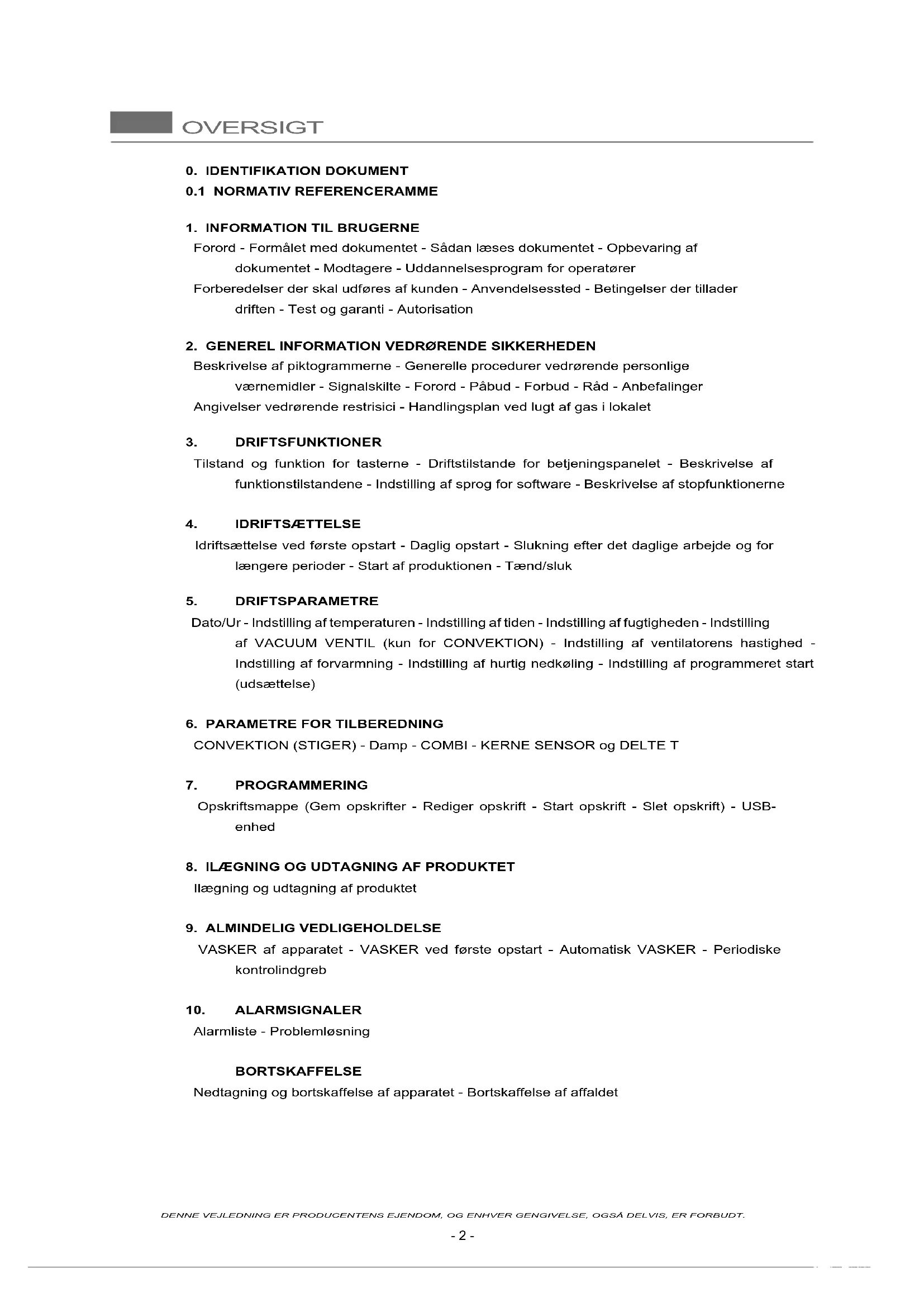 hedskrav er angivet i det specikke kapitel hvor emnet er beskrevet (se 2. Generel information vedrøren- de sikkerheden). Dette dokument må ikke overføres til tredjepart uden producentens skriftlige tilladelse. Teksten må ikke anvendes i anden tryksager uden skriftlig tilladelse fra producenten. Brugen af: Figurer/Billeder/Tegninger/Diagrammer i dette dokument, er rent vejledende og kan undergå variationer. Fabrikanten forbeholder sig ret til at foretage ændringer uden at skulle kommunikere vedrø