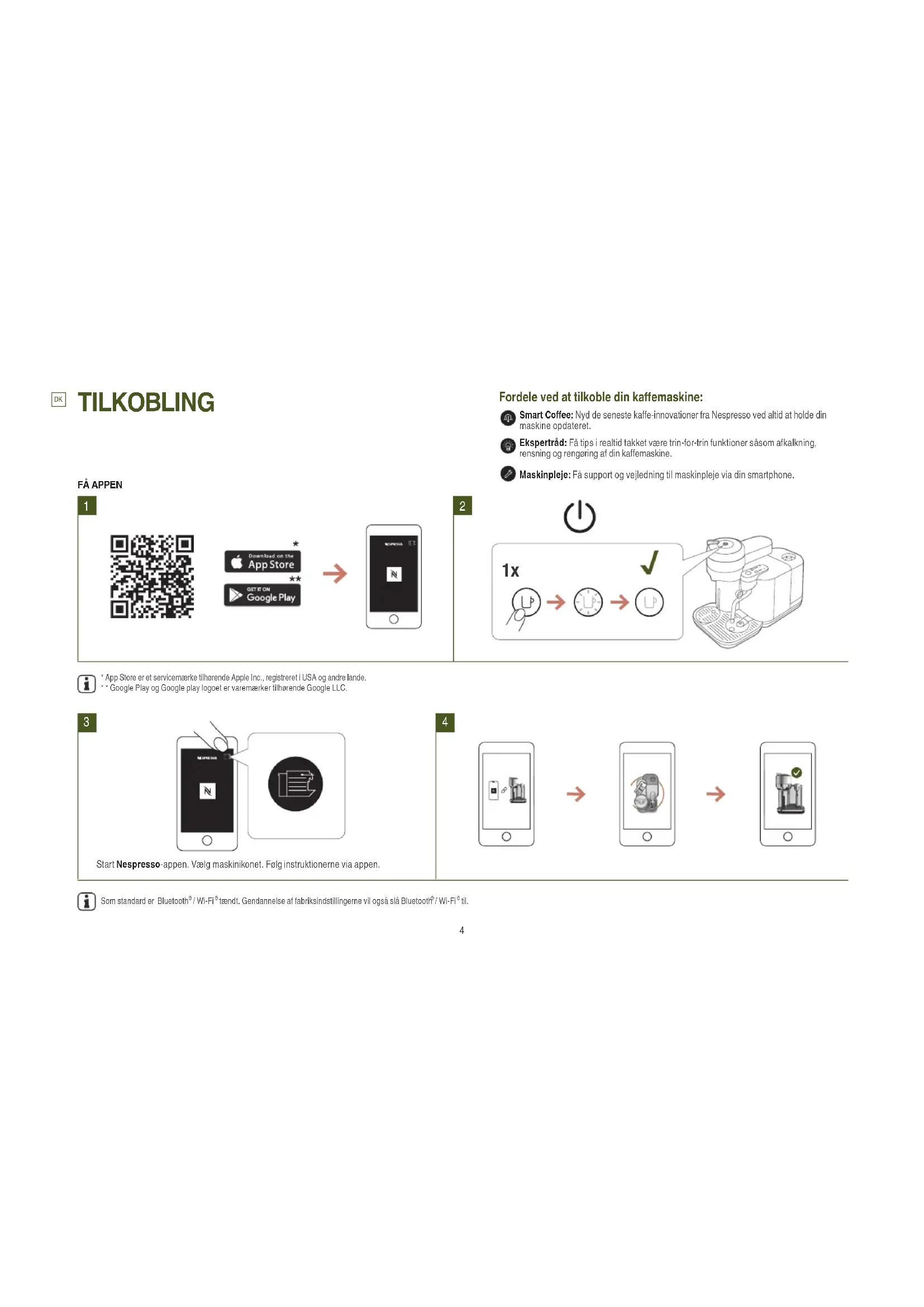 - * Google Play og Google play logoet er varemærker tilhørende Google LLC. Start Nespresso-appen. Vælg maskinikonet. Følg instruktionerne via appen. Som standard er Bluetooth