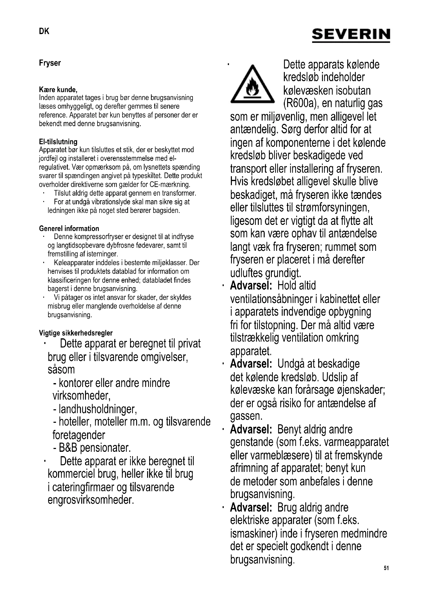 Dette apparats kølende kredsløb indeholder kølevæsken isobutan (R600a), en naturlig gas som er miljøvenlig, men alligevel let antændelig. Sørg derfor altid for at ingen af komponenterne i det kølende kredsløb bliver beskadigede ved transport eller installering af fryseren. Hvis kredsløbet alligevel skulle blive beskadiget, må fryseren ikke tændes eller tilsluttes til strømforsyningen, ligesom det er vigtigt da at ytte alt som kan være ophav til antændelse langt væk fra fryseren; rummet som fryseren er placeret i må derefter udluftes grundigt. ∙ Advarsel: Hold altid ventilationsåbninger i kabinettet eller i apparatets indvendige opbygning fri for tilstopning. Der må altid være tilstrækkelig ventilation omkring apparatet. ∙ Advarsel: Undgå at beskadige det kølende kredsløb. Udslip af kølevæske kan forårsage øjenskader; der er også risiko for antændelse af gassen. ∙ Advarsel: Benyt aldrig andre genstande (som f.eks. varmeapparatet eller varmeblæsere) til at fremskynde afrimning af apparatet; benyt kun de metoder som anbefales i denne brugsanvisning. ∙ Advarsel: Brug aldrig andre elektriske apparater (som f.eks. ismaskiner) inde i fryseren medmindre det er specielt godkendt i denne brugsanvisning.52 142 x 208 mm ∙ Inden tilslutning til strømforsyningen må fryseren og ledningen altid efterses grundigt for mulige transportskader. Hvis den form for beskadigelse bliver forefundet, må apparatet ikke tilsluttes til strømforsyningen. ∙ Når enheden installeres er det vigtigt, at ledningen ikke er fastklemt, eller på anden måde bliver beskadiget. ∙ Variable multistikdåser eller strømforsyninger må ikke anbringes på enhedens bagside. ∙ Dette apparat er ikke beregnet til opbevaring af eksplosive substanser såsom spraydåser med brændbar drivgas. ∙ Hvis apparatet sælges, overdrages til tredjepart eller bortskaffes til en genbrugsstation, må man gøre opmærksom på tilstedeværelse af både isoleringsmidlet ’cyclopenthan’ og kølevæsken R600a. Yderligere information om korrekt genbrug ndes i afsnittet om Bortskaffelse. ∙ For at overholde sikkerhedsregulativet og undgå fare, skal alle reparationer eller ændringer af denne fryser udføres af vores autoriserede servicepersonel, dette inkluderer også udskiftning af ledningen. ∙ Dette apparat kan benyttes af børn (som er mindst 8 år) og af personer med reducerede fysiske, sensoriske eller mentale evner, eller mangel på erfaring eller viden, såfremt de har fået vejledning og instruktion i brugen af dette apparat og fuldt ud forstår alle farer og forholdsregler vedrørende sikkerheden som brug af apparatet medfører. ∙ Børn i alderen fra 3 år og op til 8 år må laste og aaste køleskabet/fryseren. ∙ Børn må aldrig få lov til at lege med apparatet. ∙ Børn må aldrig få lov til at udføre nogen former for rengøring eller vedligehold af dette apparat medmindre de er under opsyn. ∙ Til regelmæssig rengøring anbefaler vi varmt vand med et mildt opvaskemiddel. Detaljeret information om rengøring af apparatet ndes i afsnittet om Afrimning og rengøring. For at undgå forurening af fødevarer, skal disse instruktioner overholdes: ∙ Hvis døren holdes åben i længere tid, kan det føre til en betydelig stigning af temperaturen i enhedens rum. ∙ Overader, der har været i kontakt med fødevarer samt tilgængelige drænsystemer, skal regelmæssigt rengøres. ∙ Hvis køleskabet/fryseren er tomt i længere tid, så skal det slukkes, afrimes og renses hvorefter døren skal efterlades åben for at forhindre mugvækst. ∙ For at undgå risiko for personskade eller beskadigelse af fryseren, må apparatet kun transporteres mens det er pakket ind i den originale emballage. Ved udpakning og installering er det nødvendigt at 2 personer hjælpes ad. ∙ Advarsel: Hold børn væk fra emballeringen, da denne udgør en mulig risiko for tilskadekomst, ved f.eks. kvælning. ∙ Den is som fjernes fra fryseren ved afrimning skal kasseres, den er ikke egnet til at blive spist. ∙ Ledningen bør jævnligt efterses for beskadigelse. Hvis man opdager fejl ved ledningen, må apparatet ikke længere benyttes. ∙ For at undgå brandfare, må man aldrig placere nogen form for elektriske apparater ovenpå fryseren. Placer53 142 x 208 mm heller aldrig nogen beholdere med væske ovenpå apparatet: Dette for at undgå at lækage eller væskespild skal kunne beskadige isoleringen på det elektriske kredsløb. ∙ Dette apparat er kun designet til opbevaring af fødevarer. ∙ Alkohol må kun opbevares i tæt forseglede beholdere og skal altid stå oprejst. ∙ Opbevar aldrig glasasker med kulsyreholdige eller andre væsker, som kan indfryses i fryseren: Den slags asker kan sprænges under indfrysningen. ∙ For at undgå risiko for madforgiftning, bør man aldrig spise fødevarer hvor holdbarhedsdatoen er overskredet. Optøede madvarer må aldrig indfryses igen. ∙ Man må aldrig hænge i eller lægge urimelig meget vægt på hylderne, skufferne, døren etc. ∙ Beskyt altid fryserens indre mod åben ild og alle andre kilder til antændelse. ∙ Tag altid stikket ud af stikkontakten - i tilfælde af fejlfunktion, - inden afrimning, - under rengøring, - inden vedligehold eller reparationer udføres. ∙ Træk aldrig i selve ledningen, når ledningen tages ud af stikkontakten; tag altid fat i selve stikket. ∙ Hvis apparatet ikke benyttes i en længere periode, anbefaler vi at døren står åben. ∙ Vi forbeholder os ret til at ændre apparatets specikationer. Oversigt