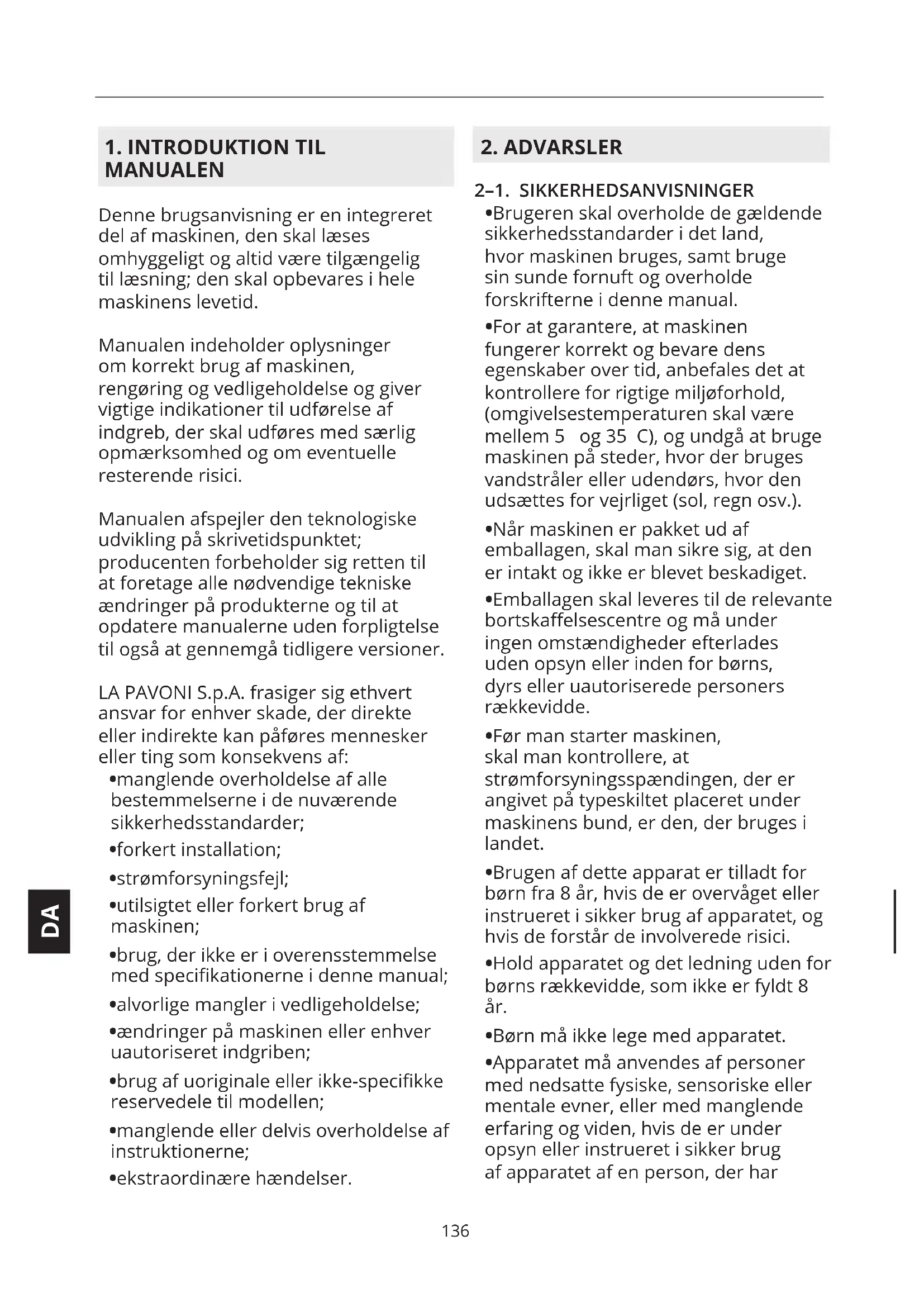 MANUALEN Denne brugsanvisning er en integreret del af maskinen, den skal læses omhyggeligt og altid være tilgængelig til læsning; den skal opbevares i hele maskinens levetid. Manualen indeholder oplysninger om korrekt brug af maskinen, rengøring og vedligeholdelse og giver vigtige indikationer til udførelse af indgreb, der skal udføres med særlig opmærksomhed og om eventuelle resterende risici. Manualen afspejler den teknologiske udvikling på skrivetidspunktet; producenten forbeholder sig retten til at foretage alle nødvendige tekniske ændringer på produkterne og til at opdatere manualerne uden forpligtelse til også at gennemgå tidligere versioner. LA PAVONI S.p.A. frasiger sig ethvert ansvar for enhver skade, der direkte eller indirekte kan påføres mennesker eller ting som konsekvens af: