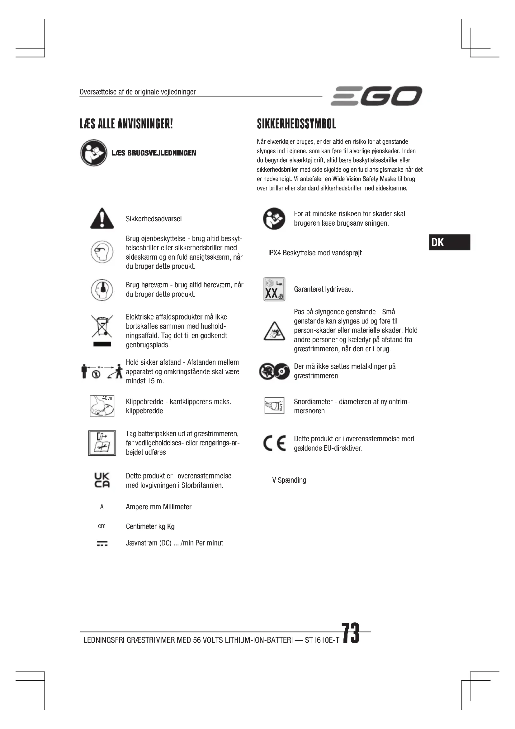 Garanteret lydniveau.Elektriske affaldsprodukter må ikke bortskaffes sammen med hushold-ningsaffald. Tag det til en godkendt genbrugsplads.Pas på slyngende genstande - Små-genstande kan slynges ud og føre til person-skader eller materielle skader. Hold andre personer og kæledyr på afstand fra græstrimmeren, når den er i brug.Hold sikker afstand - Afstanden mellem apparatet og omkringstående skal være mindst 15 m.Der må ikke sættes metalklinger på græstrimmeren 40cm Klippebredde - kantklipperens maks. klippebredde 2.4mmSnordiameter - diameteren af nylontrim-mersnorenTag batteripakken ud af græstrimmeren, før vedligeholdelses- eller rengørings-ar-bejdet udføresDette produkt er i overensstemmelse med gældende EU-direktiver.Dette produkt er i overensstemmelse med lovgivningen i Storbritannien.V Spænding Ampere mm Millimeter Centimeter kg KgJævnstrøm (DC) ... /min Per minutLEDNINGSFRI GRÆSTRIMMER MED 56 VOLTS LITHIUM-ION-BATTERI — ST1610E-T74
