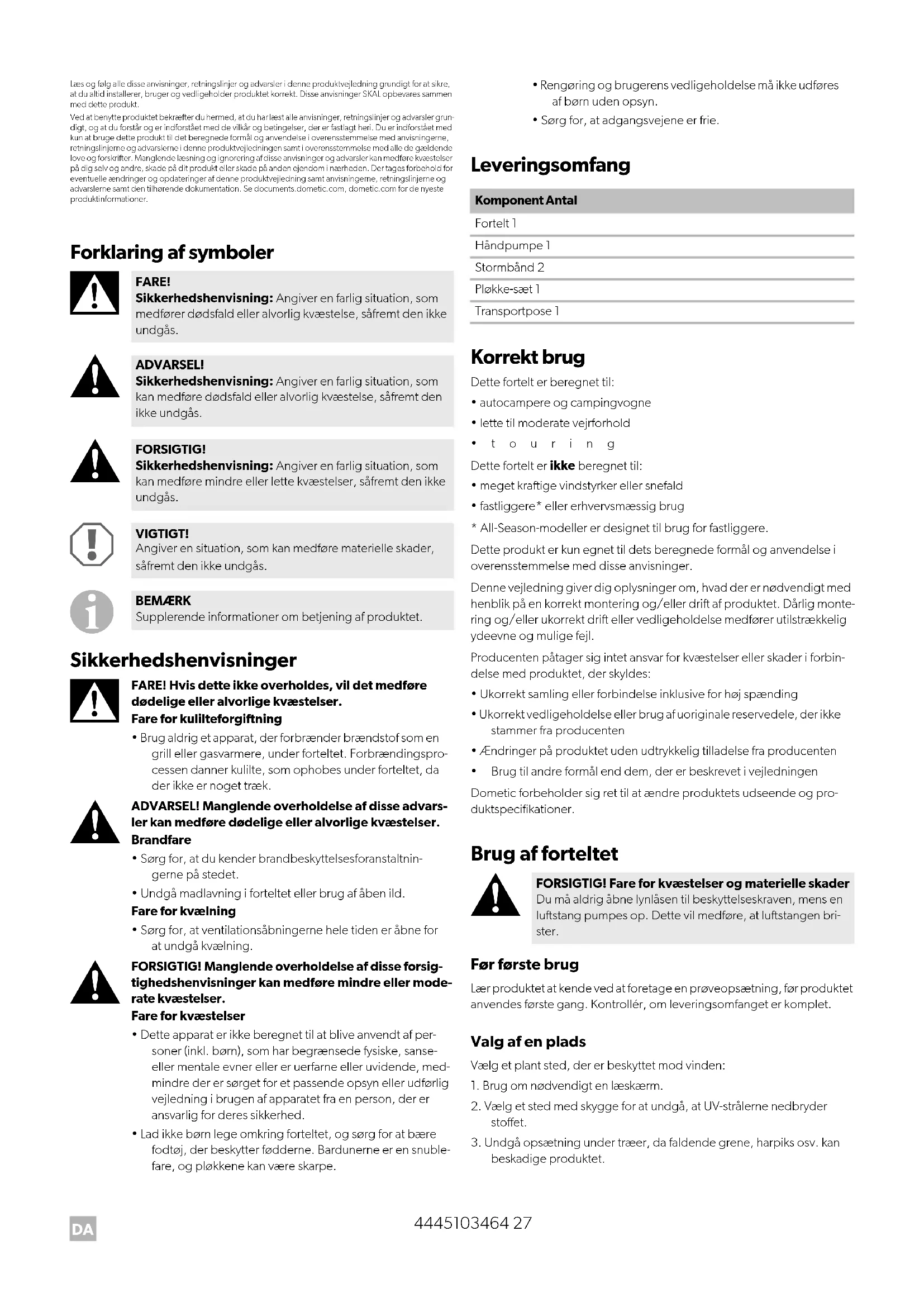 beskadige produktet. FARE! Sikkerhedshenvisning: Angiver en farlig situation, som medfører dødsfald eller alvorlig kvæstelse, såfremt den ikke undgås. ADVARSEL! Sikkerhedshenvisning: Angiver en farlig situation, som kan medføre dødsfald eller alvorlig kvæstelse, såfremt den ikke undgås. FORSIGTIG! Sikkerhedshenvisning: Angiver en farlig situation, som kan medføre mindre eller lette kvæstelser, såfremt den ikke undgås. VIGTIGT! Angiver en situation, som kan medføre materielle skader, såfremt den ikke undgås. BEMÆRK Supplerende informationer om betjening af produktet. Komponent Antal Fortelt 1 Håndpumpe 1 Stormbånd 2 Pløkke-sæt 1 Transportpose 1 FORSIGTIG! Fare for kvæstelser og materielle skader Du må aldrig åbne lynlåsen til beskyttelseskraven, mens en luftstang pumpes op. Dette vil medføre, at luftstangen bri- ster. DometicSunshineAirPro300-500_IOM_4445103464_EMEA16_xxxx-xx-xx.book Seite 27 Donnerstag, 30. September 2021 3:10 15DA