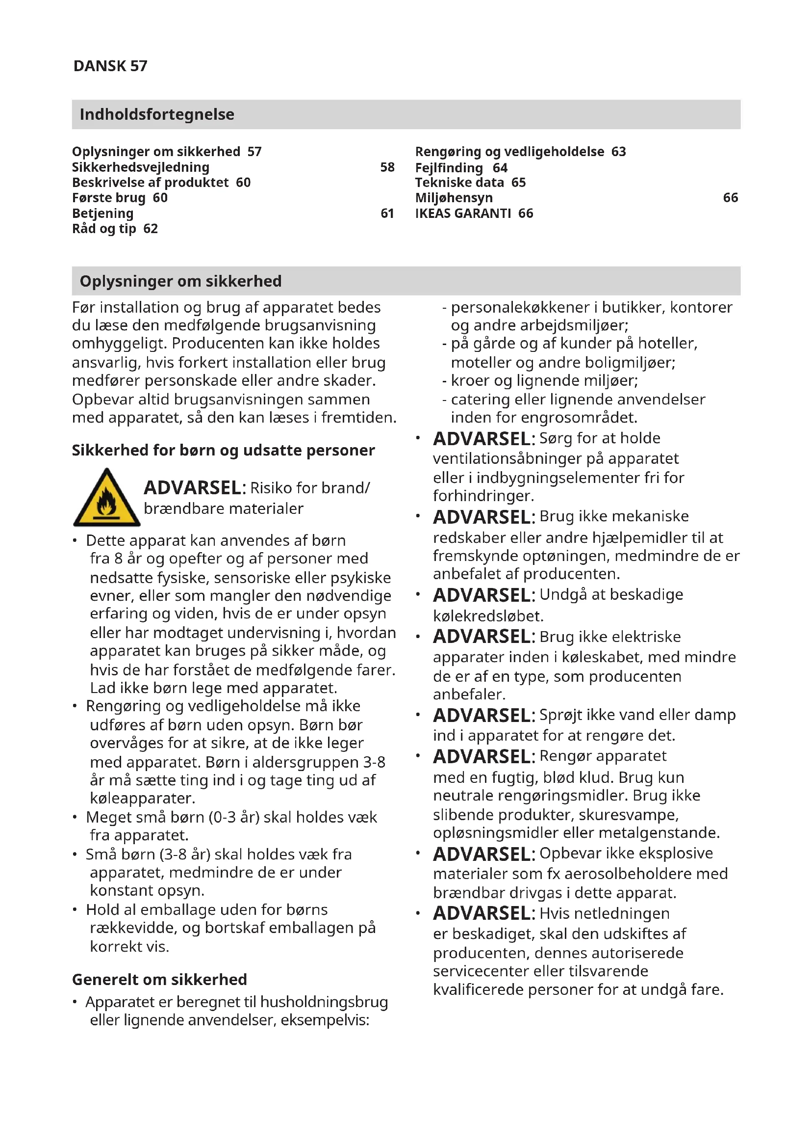 - få præcisering omkring funktionaliteten af IKEA- produktet. For at sikre, at vi yder dig den bedste assistance, bedes du venligst have læst monteringsvejledningen og/eller brugervejledningen omhyggeligt igennem, inden du kontakter os. Hvordan kontakter du os i tilfælde af servicebehov? Du kan nde telefonnumrene på de IKEA-udpegede udbydere af eftersalgsservice bagerst i vejledningen. Vi anbefaler, at du bruger telefonnumrene i vejledningen, så vi kan give dig en hurtigere service. Referér altid til telefonnumrene ibrugervejledningenfordetspecikke apparat, som du har brug for hjælp til. Husk at oplyse varenummeret på otte cifre og serienummeretpå22cifre,derndespå typeskiltet på dit apparat. GEM KØBSKVITTERINGEN! Den er dit bevis på købet og er nødvendig for garantiens gyldighed. Købskvitteringen indeholder ligeledes IKEA navnet og produktnummeret (8-cifret kode) for hver produkt, der er købt. Har du brug for ekstra hjælp? For øvrige spørgsmål, der ikke vedrører service og/eller garanti på dit produkt, henviser vi til IKEA butikkens kundeservice. Vi anbefaler, at du læser dokumentationen til produktet omhyggeligt igennem, inden du kontakter os.DANSK 68 Oplysninger om reservedele - Professionelle reparatører kan få følgende reservedele i mindst syv år efter, at den sidste enhed af modellen kom på markedet: termostater, temperatursensorer, printkort og lyskilder. - Professionelle reparatører og slutbrugere kan få følgende reservedele i mindst syv år efter, at den sidste enhed af modellen kom på markedet: dørhåndtag, dørhængsler, bakker og kurve. For dørpakninger er minimumsperioden 10 år. Du nder reservedelene på: www.ikea.comNORSK 69 Innholdsfortegnelse Sikkerhetsinformasjon Les instruksjonene nøye før du installerer og bruker apparatet. Produsenten er ikke ansvarlig dersom feil installasjon eller bruk forårsaker personskader eller skader. Oppbevar instruksjonene sammen med apparatet til senere bruk. Sikkerhet for barn og utsatte personer ADVARSEL: Risiko for brann / brennbare materialer