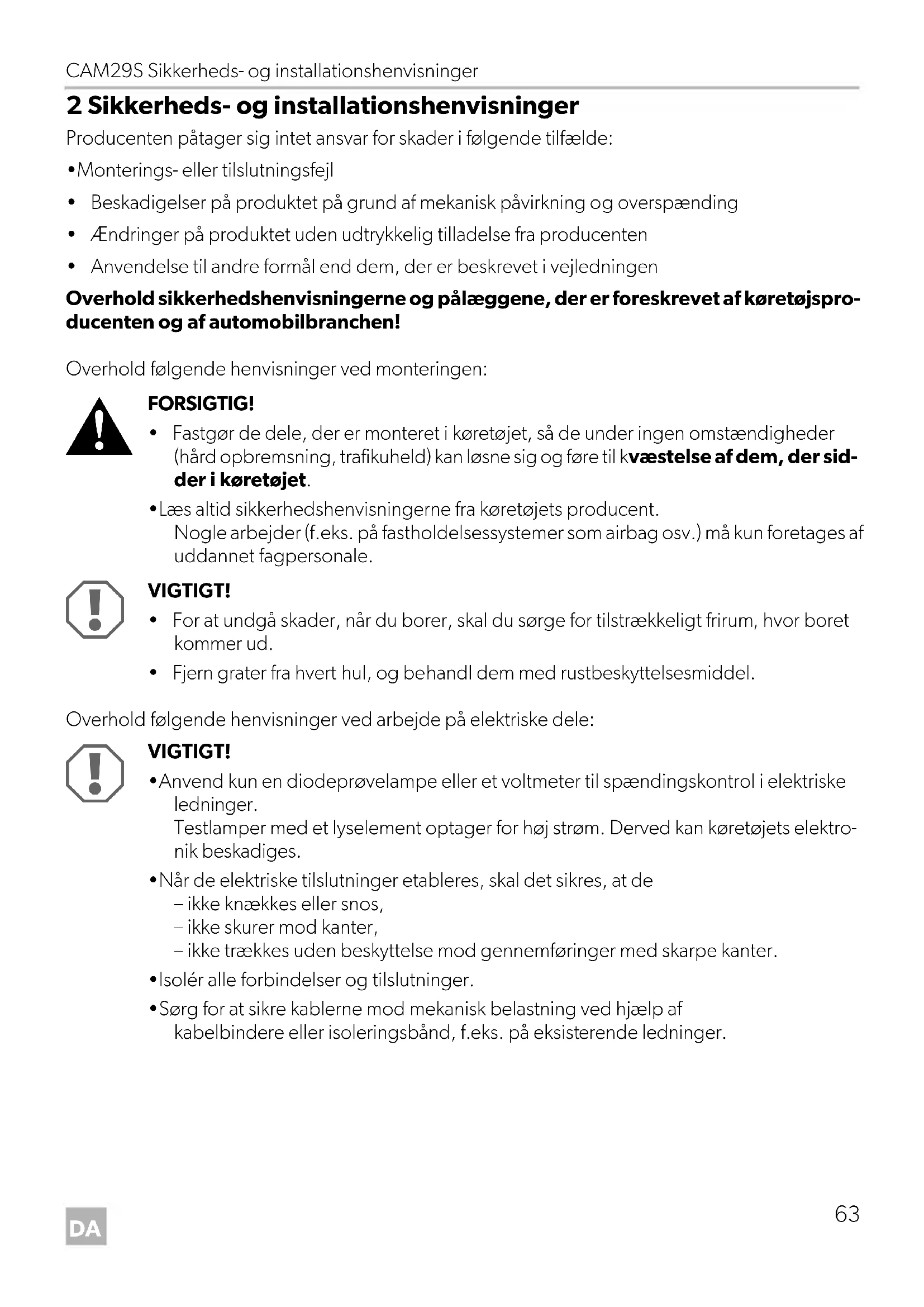 FORSIGTIG! Sikkerhedshenvisning: Manglende overholdelse kan medføre kvæstelser. VIGTIGT! Manglende overholdelse kan medføre materielle skader og begrænse produktets funktion. BEMÆRK Supplerende informationer om betjening af produktet. CAM29S-IO-16s.book Seite 62 Mittwoch, 7. Dezember 2016 5:03 17CAM29S Sikkerheds- og installationshenvisninger