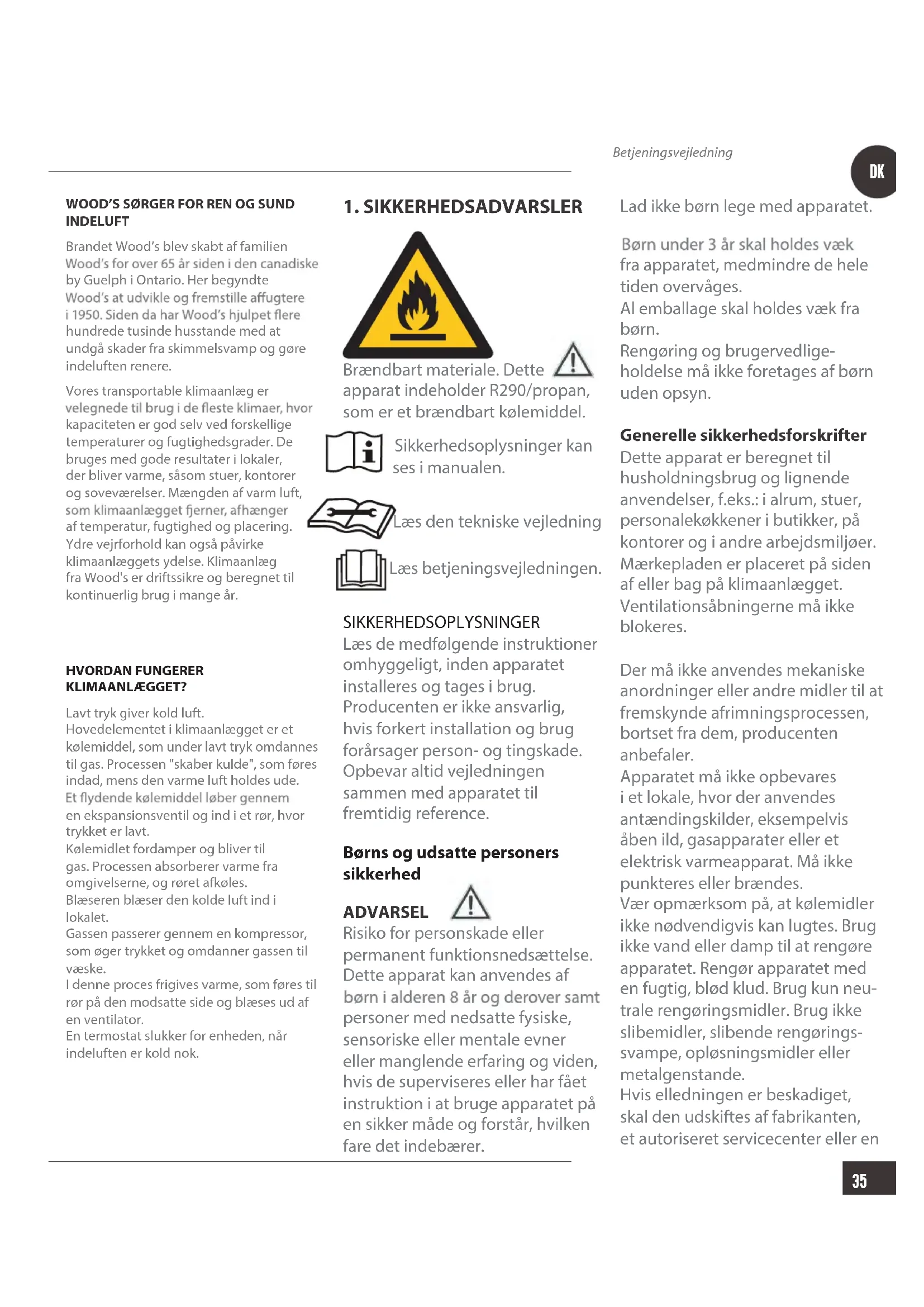 BetjeningsvejledningWOOD’S SØRGER FOR REN OG SUND INDELUFTBrandet Wood’s blev skabt af familien by Guelph i Ontario. Her begyndte hundrede tusinde husstande med at undgå skader fra skimmelsvamp og gøre indeluften renere. Vores transportable klimaanlæg er kapaciteten er god selv ved forskellige temperaturer og fugtighedsgrader. De bruges med gode resultater i lokaler, der bliver varme, såsom stuer, kontorer og soveværelser. Mængden af varm luft, af temperatur, fugtighed og placering. Ydre vejrforhold kan også påvirke klimaanlæggets ydelse. Klimaanlæg fra Wood's er driftssikre og beregnet til kontinuerlig brug i mange år. HVORDAN FUNGERER KLIMAANLÆGGET?Lavt tryk giver kold luft.Hovedelementet i klimaanlægget er et kølemiddel, som under lavt tryk omdannes til gas. Processen "skaber kulde", som føres indad, mens den varme luft holdes ude.en ekspansionsventil og ind i et rør, hvor trykket er lavt.Kølemidlet fordamper og bliver til gas. Processen absorberer varme fra omgivelserne, og røret afkøles.Blæseren blæser den kolde luft ind i lokalet.Gassen passerer gennem en kompressor, som øger trykket og omdanner gassen til væske.I denne proces frigives varme, som føres til rør på den modsatte side og blæses ud af en ventilator.En termostat slukker for enheden, når indeluften er kold nok.
