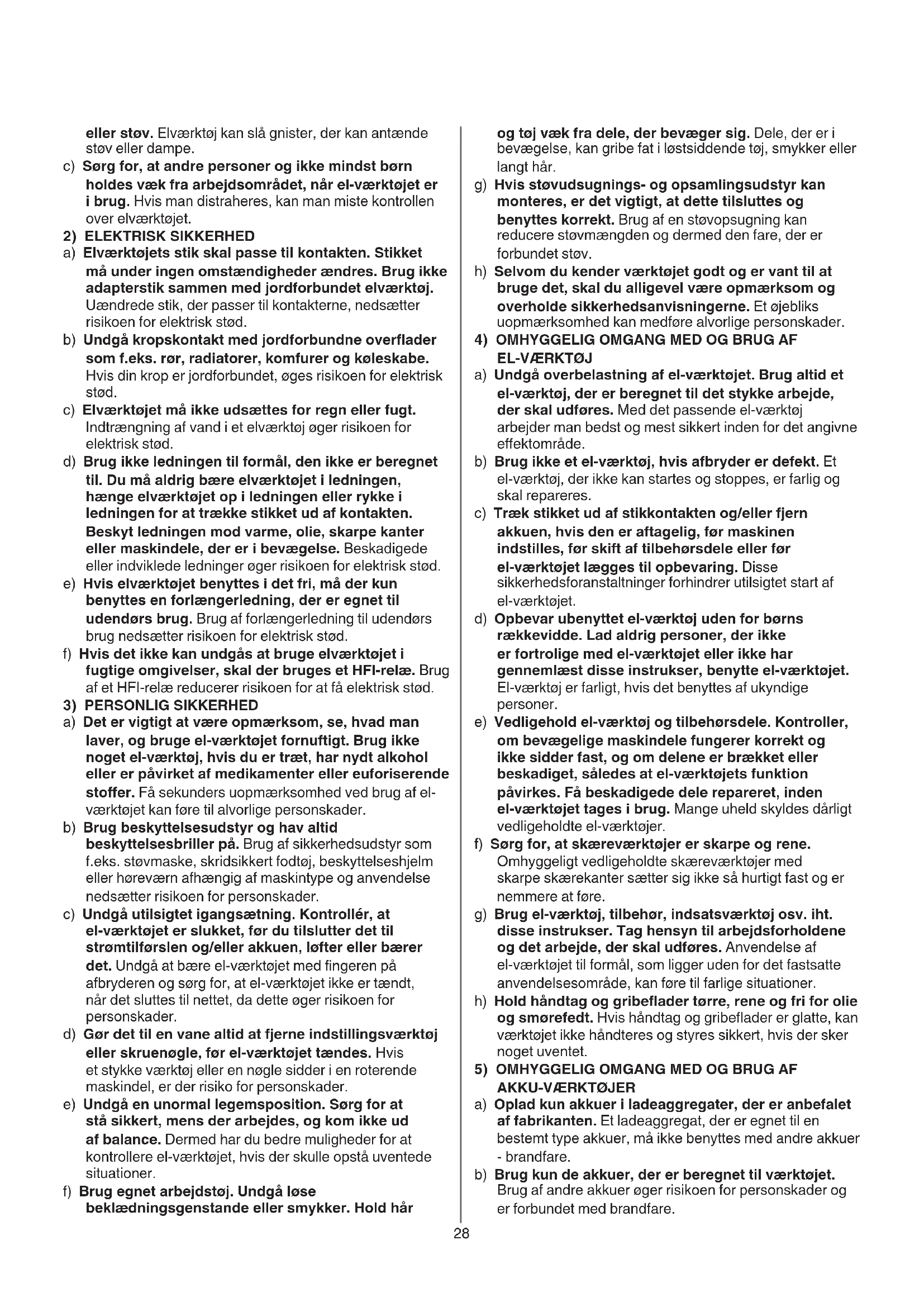 a) Det er vigtigt at være opmærksom, se, hvad man laver, og bruge el-værktøjet fornuftigt. Brug ikke noget el-værktøj, hvis du er træt, har nydt alkohol eller er påvirket af medikamenter eller euforiserende stoer. Få sekunders uopmærksomhed ved brug af el- værktøjet kan føre til alvorlige personskader. b) Brug beskyttelsesudstyr og hav altid beskyttelsesbriller på. Brug af sikkerhedsudstyr som f.eks. støvmaske, skridsikkert fodtøj, beskyttelseshjelm eller høreværn afhængig af maskintype og anvendelse nedsætter risikoen for personskader. c) Undgå utilsigtet igangsætning. Kontrollér, at el-værktøjet er slukket, før du tilslutter det til strømtilførslen og/eller akkuen, løfter eller bærer det. Undgå at bære el-værktøjet med ngeren på afbryderen og sørg for, at el-værktøjet ikke er tændt, når det sluttes til nettet, da dette øger risikoen for personskader. d) Gør det til en vane altid at fjerne indstillingsværktøj eller skruenøgle, før el-værktøjet tændes. Hvis et stykke værktøj eller en nøgle sidder i en roterende maskindel, er der risiko for personskader. e) Undgå en unormal legemsposition. Sørg for at stå sikkert, mens der arbejdes, og kom ikke ud af balance. Dermed har du bedre muligheder for at kontrollere el-værktøjet, hvis der skulle opstå uventede situationer. f) Brug egnet arbejdstøj. Undgå løse beklædningsgenstande eller smykker. Hold hår29 luftvejene hos den, der anvender værktøjet, eller hos omkringstående); bær en støvmaske og arbejd med en støvudsugningsanordning, hvor en sådan kan sluttes til