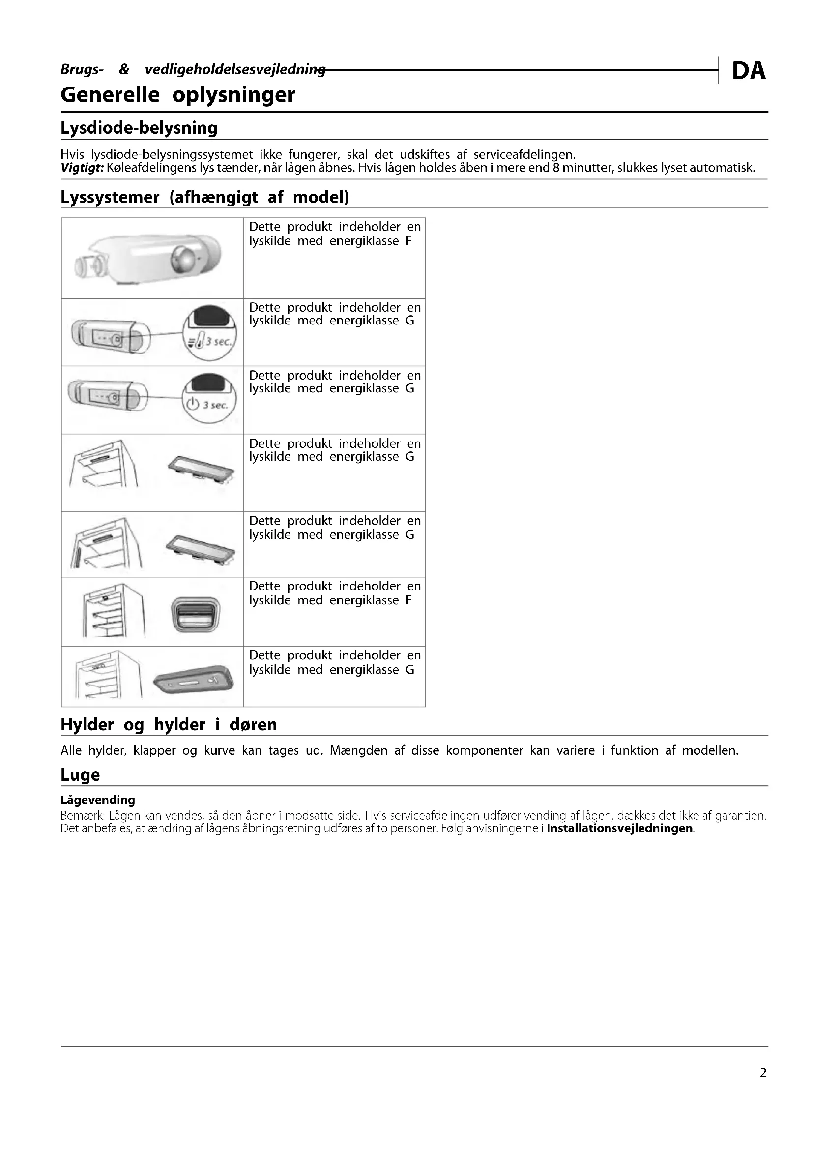 Generelle oplysninger Lysdiode-belysning Hvis lysdiode-belysningssystemet ikke fungerer, skal det udskiftes af serviceafdelingen. Vigtigt: Køleafdelingens lys tænder, når lågen åbnes. Hvis lågen holdes åben i mere end 8 minutter, slukkes lyset automatisk. Lyssystemer (afhængigt af model) Dette produkt indeholder en lyskilde med energiklasse F Dette produkt indeholder en lyskilde med energiklasse G Dette produkt indeholder en lyskilde med energiklasse G Dette produkt indeholder en lyskilde med energiklasse G Dette produkt indeholder en lyskilde med energiklasse G Dette produkt indeholder en lyskilde med energiklasse F Dette produkt indeholder en lyskilde med energiklasse G Hylder og hylder i døren Alle hylder, klapper og kurve kan tages ud. Mængden af disse komponenter kan variere i funktion af modellen. Luge Lågevending Bemærk: Lågen kan vendes, så den åbner i modsatte side. Hvis serviceafdelingen udfører vending af lågen, dækkes det ikke af garantien. Det anbefales, at ændring af lågens åbningsretning udføres af to personer. Følg anvisningerne i Installationsvejledningen.Brugs- & vedligeholdelsesvejledning