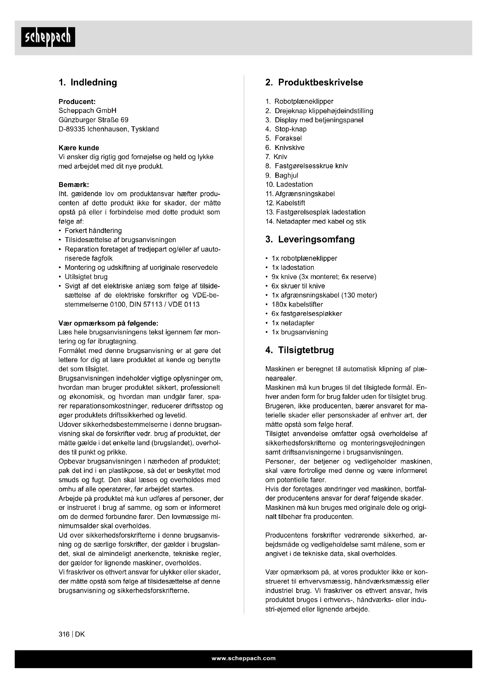 Producent: Scheppach GmbH Günzburger Straße 69 D-89335 Ichenhausen, Tyskland Kære kunde Vi ønsker dig rigtig god fornøjelse og held og lykke med arbejdet med dit nye produkt. Bemærk: Iht. gældende lov om produktansvar hæfter produ- centen af dette produkt ikke for skader, der måtte opstå på eller i forbindelse med dette produkt som følge af: