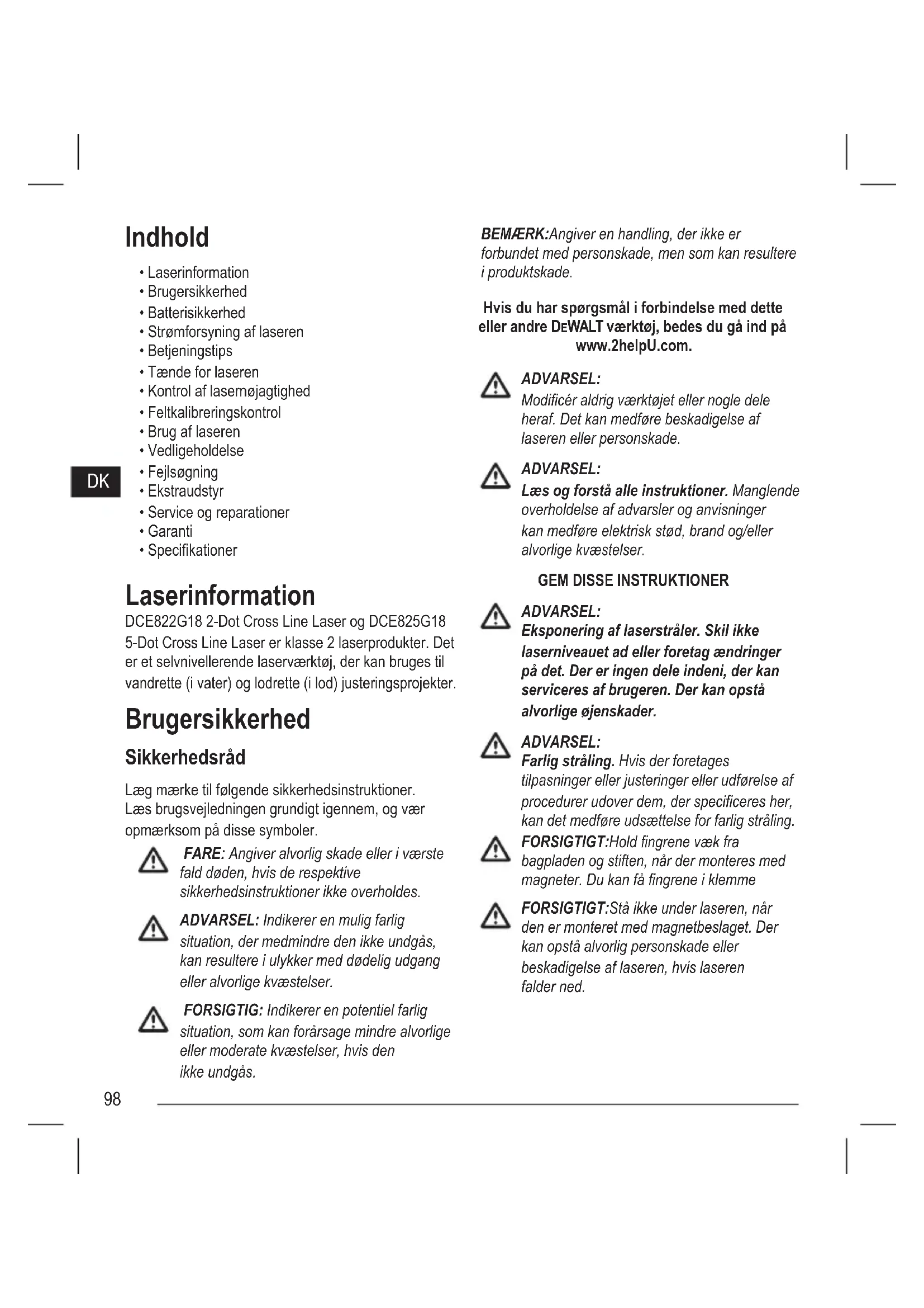 - Specikationer Laserinformation DCE822G18 2-Dot Cross Line Laser og DCE825G18 5-Dot Cross Line Laser er klasse 2 laserprodukter. Det er et selvnivellerende laserværktøj, der kan bruges til vandrette (i vater) og lodrette (i lod) justeringsprojekter. Brugersikkerhed Sikkerhedsråd Læg mærke til følgende sikkerhedsinstruktioner. Læs brugsvejledningen grundigt igennem, og vær opmærksom på disse symboler. FARE: Angiver alvorlig skade eller i værste fald døden, hvis de respektive sikkerhedsinstruktioner ikke overholdes. ADVARSEL: Indikerer en mulig farlig situation, der medmindre den ikke undgås, kan resultere i ulykker med dødelig udgang eller alvorlige kvæstelser. FORSIGTIG: Indikerer en potentiel farlig situation, som kan forårsage mindre alvorlige eller moderate kvæstelser, hvis den ikke undgås. BEMÆRK: Angiver en handling, der ikke er forbundet med personskade, men som kan resultere i produktskade. Hvis du har spørgsmål i forbindelse med dette eller andre DEWALT værktøj, bedes du gå ind på www.2helpU.com. ADVARSEL: Modicér aldrig værktøjet eller nogle dele heraf. Det kan medføre beskadigelse af laseren eller personskade. ADVARSEL: Læs og forstå alle instruktioner. Manglende overholdelse af advarsler og anvisninger kan medføre elektrisk stød, brand og/eller alvorlige kvæstelser.