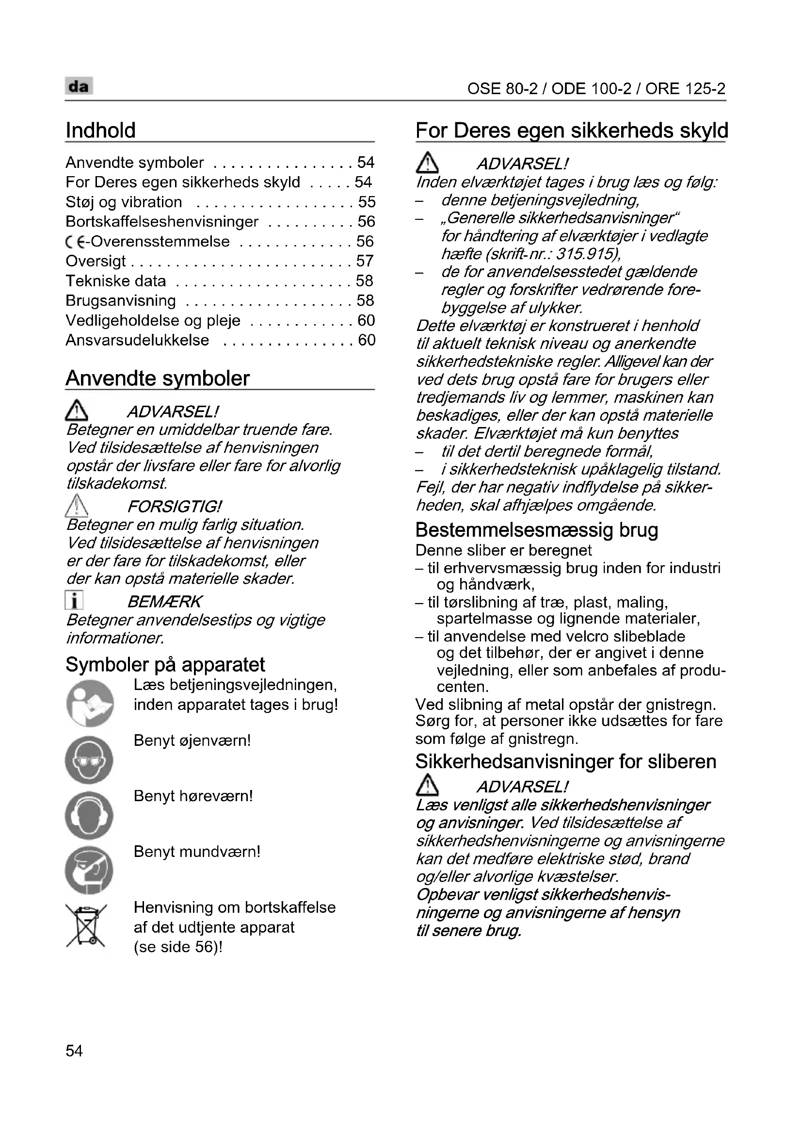- Ansvarsudelukkelse Anvendte symboler ADVARSEL! Betegner en umiddelbar truende fare. Ved tilsidesættelse af henvisningen opstår der livsfare eller fare for alvorlig tilskadekomst. FORSIGTIG! Betegner en mulig farlig situation. Ved tilsidesættelse af henvisningen er der fare for tilskadekomst, eller der kan opstå materielle skader. BEMÆRK Betegner anvendelsestips og vigtige informationer. Symboler på apparatet Læs betjeningsvejledningen, inden apparatet tages i brug! Benyt øjenværn! Benyt høreværn! Benyt mundværn! Henvisning om bortskaffelse af det udtjente apparat (se side 56)! For Deres egen sikkerheds skyld ADVARSEL! Inden elværktøjet tages i brug læs og følg: p. 60