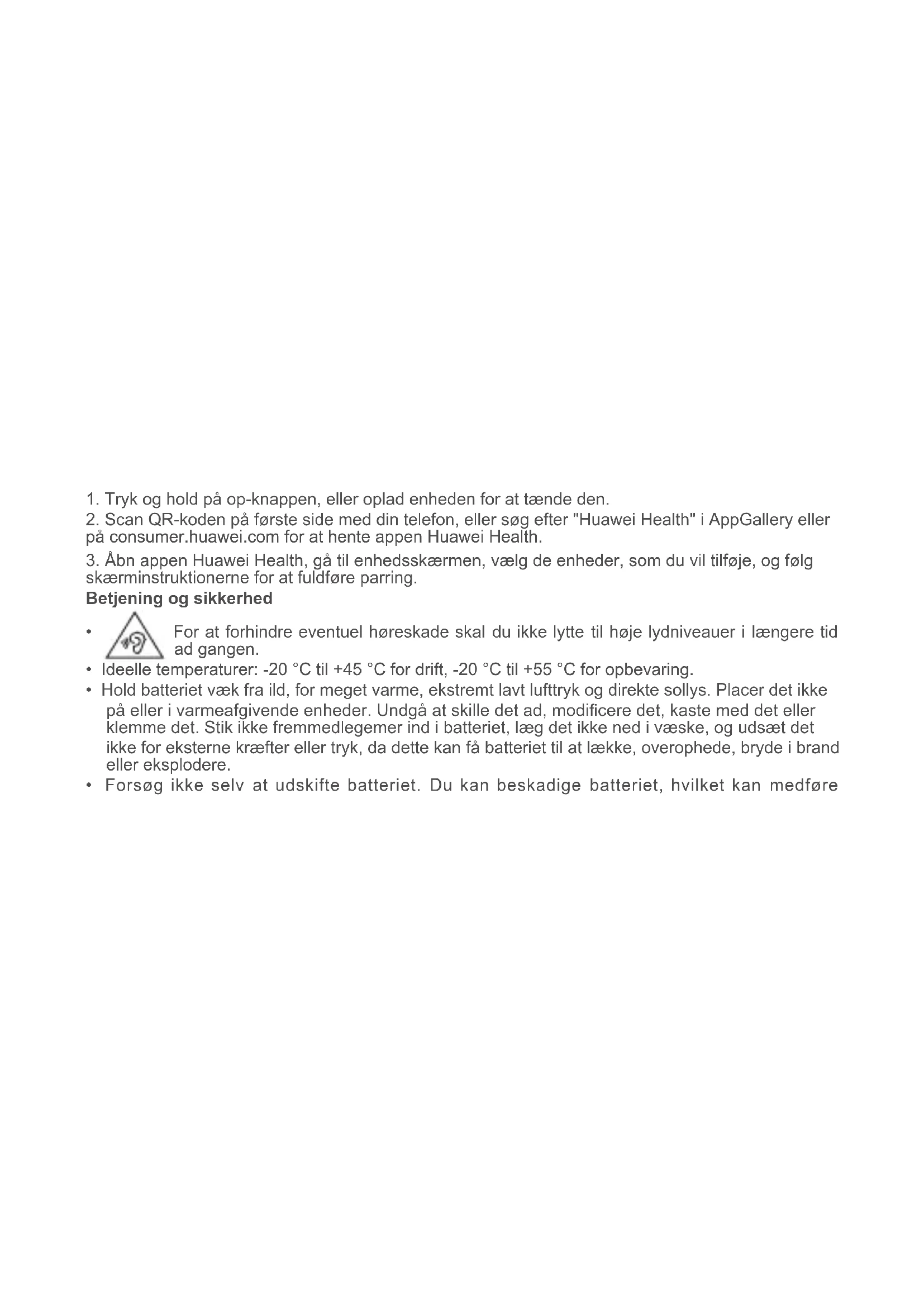 - Forsøg ikke selv at udskifte batteriet. Du kan beskadige batteriet, hvilket kan medføre146 overophedning, brand og personskade. Det indbyggede batteri i din enhed bør serviceres af Huawei eller en godkendt tjenesteudbyder.