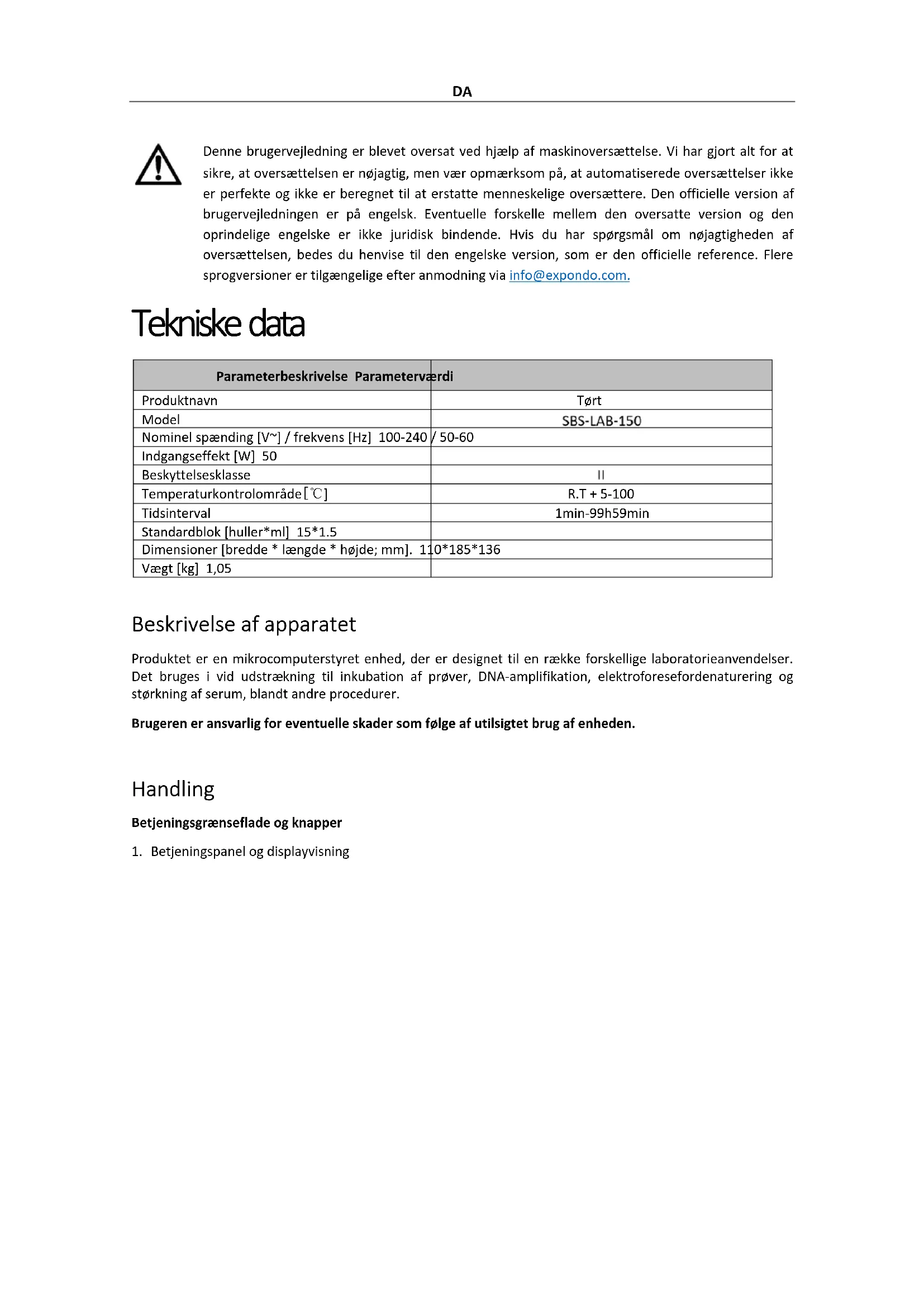 a) Tryk på knappen for at kombinere temperaturpunkterne for S1, S2, S3, S4 og S5 i flerpunktsforbindelsesprogrammer, f.eks. S1-S2, S1-S2-S3, S1-S2-S3-S4 eller S1-S2-S3-S4-S5. BEMÆRK! Temperaturpunktet i flerpunktsprogrammet kan kun starte fra S1. b) For at indstille et forbindelsesprogram for S1-S2-S3-S4 skal du f.eks. trykke på knappen . Displayet viser den aktuelle konfiguration, hvor S1 er startknudepunktet (som ikke kan ændres), og S2 er slutknudepunktet (som kan ændres). Tryk på knappen for at ændre S2 til S4. Tryk derefter på knappen for at bekræfte indstillingen. Nodekonfigurationen vil blive vist som S1-4, og programmet vil køre gennem S1-S2-S3-S4-sekvensen. c) Tryk på knappen igen for at køre S1-S2-S3-S4-firepunktsforbindelsesprogrammet.DA Betjen flerpunktsprogrammet BEMÆRK! Når du har valgt slutknudepunktet, kan du trykke på knappen for at køre flerpunktsprogrammet direkte. Rengøring og vedligeholdelse Brug en ren, blød klud fugtet med en lille smule vandfri alkohol til at rengøre de koniske huller i instrumentets blokke. Det sikrer fuld kontakt og effektiv varmeledning mellem reagensglasset og de koniske huller, samtidig med at det forhindrer kontaminering. Hvis der opstår pletter på instrumentets overflade, skal du rengøre det med en blød klud og en mild rengøringspasta. FORSIGTIG Sørg for, at strømforsyningen er slukket, før du rengør instrumentet. Lad IKKE rengøringsmidler komme ind i konushullerne under rengøringen. Undgå at bruge ætsende rengøringsmidler på instrumentets overflade. Bortskaffelse af brugte enheder Bortskaf ikke denne enhed i det kommunale affaldssystem. Aflever den på et genbrugs- og indsamlingssted for elektriske apparater. Tjek symbolet på produktet, brugsanvisningen og emballagen. Den plast, der bruges til at konstruere enheden, kan genbruges efter deres mærkning. Ved at vælge at genbruge yder du et væsentligt bidrag til beskyttelsen af vores miljø. Kontakt de lokale myndigheder for at få oplysninger om din lokale genbrugsstation.FI Tämä käyttöopas on käännetty konekäännöksellä. Olemme tehneet kaikkemme varmistaaksemme käännöksen tarkkuuden, mutta huomaa, että automaattiset käännökset eivät ole täydellisiä eivätkä ne ole tarkoitettu korvaamaan ihmiskääntäjiä. Käyttöoppaan virallinen versio on englanninkielinen. Erot käännetyn version ja alkuperäisen englanninkielisen version välillä eivät ole oikeudellisesti sitovia. Jos sinulla on kysyttävää käännöksen oikeellisuudesta, katso englanninkielinen versio, joka on virallinen viite. Lisää kieliversioita on saatavilla pyynnöstä osoitteesta info@expondo.com . Tekniset tiedot Parametrin kuvaus Parametrin arvo Tuotteen nimi Kuiva kylpy Malli Nimellisjännite [V~] / taajuus [Hz] 100-240 / 50-60 Tuloteho [W] 50 Suojausluokka Lämpötilan säätöalue [ ℃ ] RT + 5-100 Ajoitusalue 1min-99h59min Vakiolohko [reiät*ml] 15*1.5 Mitat [leveys * pituus * korkeus; mm] 110*185*136 Paino [kg] 1,05 Kuvaus Tuote on mikrotietokoneohjattu laite, joka on suunniteltu erilaisiin laboratoriotarkoituksiin. Sitä käytetään laajalti näytteiden inkubaatioon, DNA:n monistamiseen, elektroforeesien esidenaturointiin ja seerumin kiinteyttämiseen muiden toimenpiteiden ohella. Käyttäjä on vastuussa kaikista vahingoista, jotka aiheutuvat laitteen virheellisestä käytöstä. Käyttö Käyttöliittymä ja painikkeet