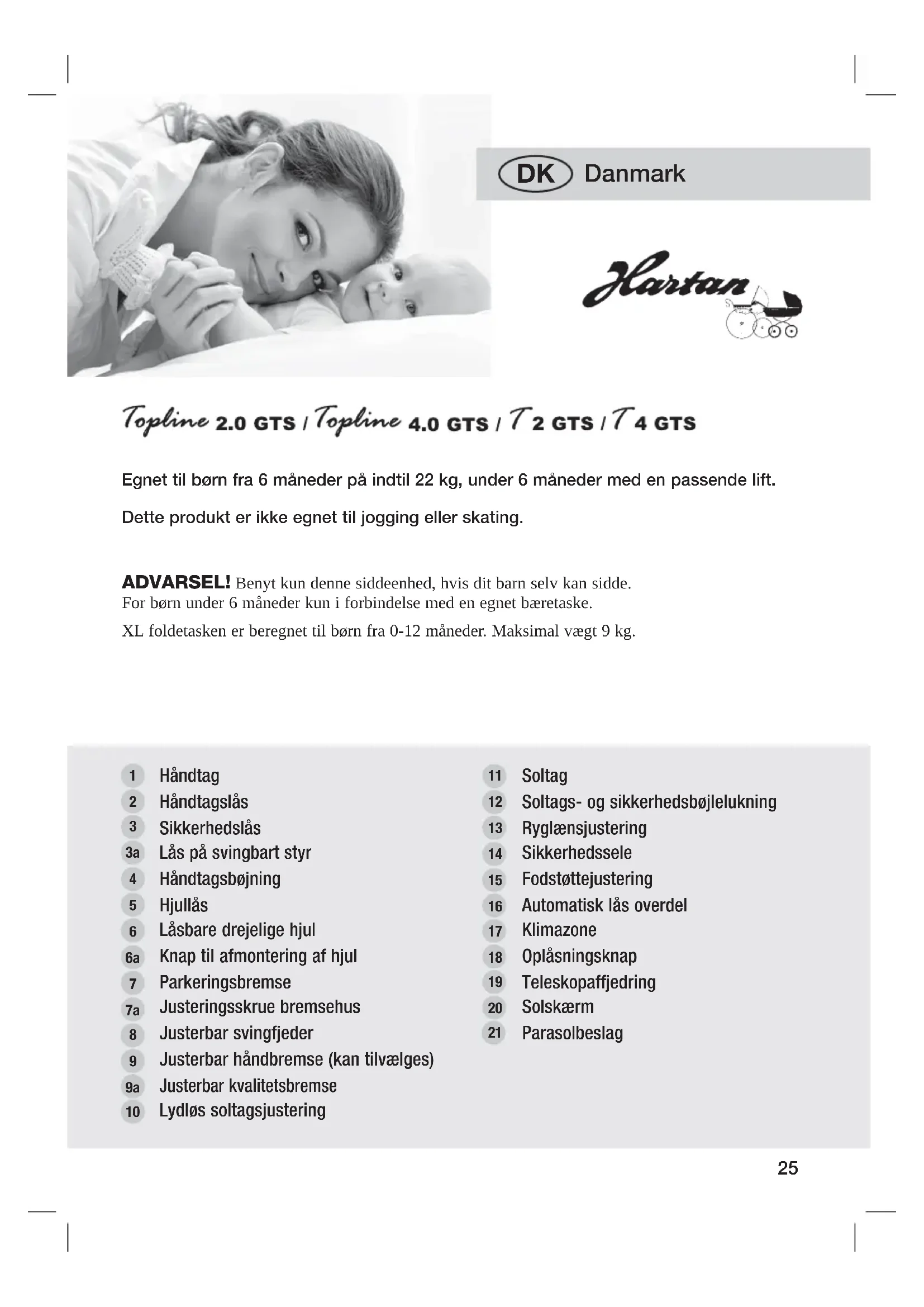 Egnet til børn fra 6 måneder på indtil 22 kg, under 6 måneder med en passende lift.Dette produkt er ikke egnet til jogging eller skating. Håndtag Håndtagslås Sikkerhedslås Lås på svingbart styr Håndtagsbøjning Hjullås Låsbare drejelige hjul Knap til afmontering af hjul Parkeringsbremse Justeringsskrue bremsehus Justerbar svingfjeder Justerbar håndbremse (kan tilvælges) Justerbar kvalitetsbremse Lydløs soltagsjustering Soltag Soltags- og sikkerhedsbøjlelukning Ryglænsjustering Sikkerhedssele Fodstøttejustering Automatisk lås overdel Klimazone Oplåsningsknap Teleskopaffjedring Solskærm Parasolbeslag
