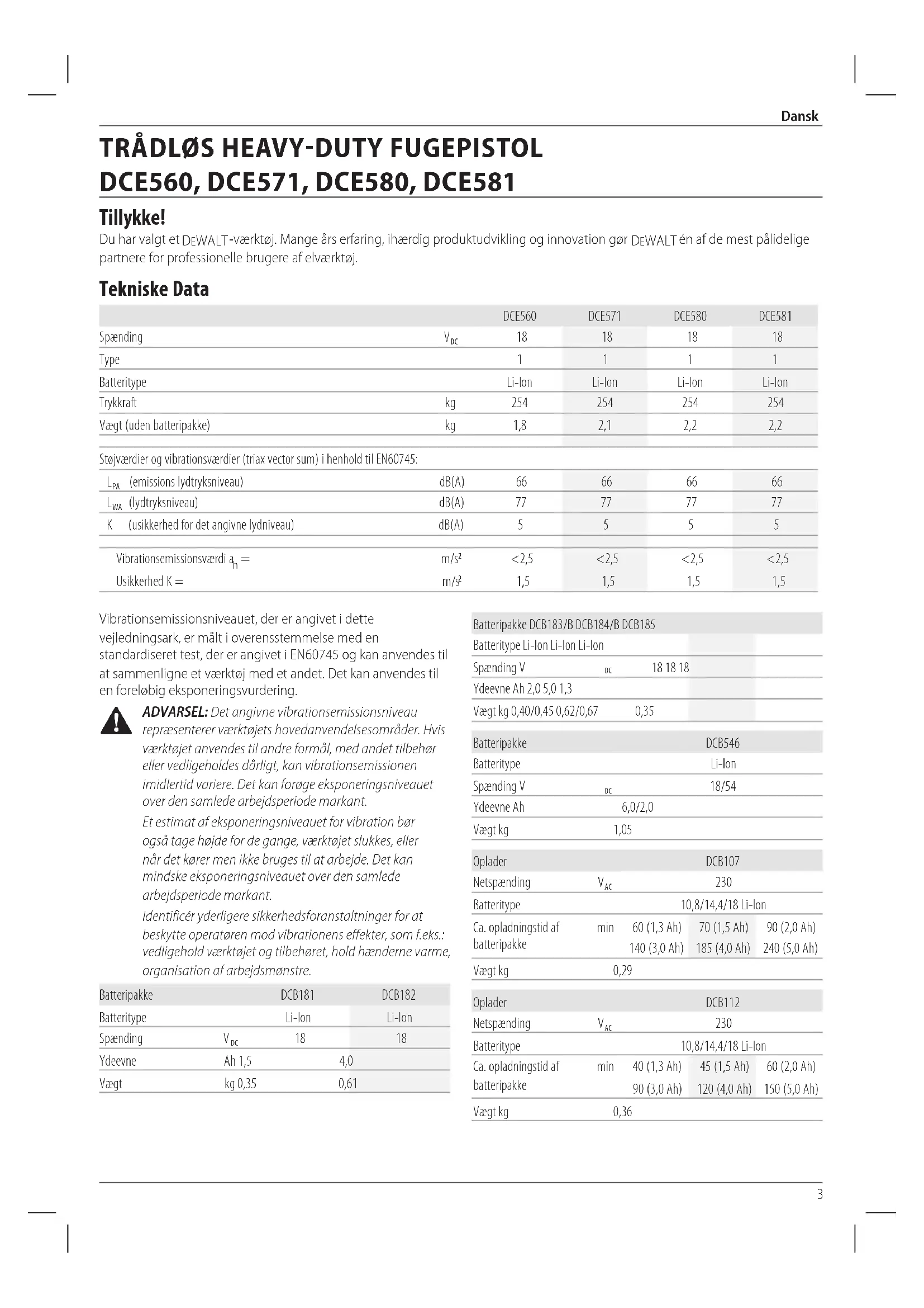 Tillykke! Du har valgt et DeWALT -værktøj. Mange års erfaring, ihærdig produktudvikling og innovation gør DeWALT én af de mest pålidelige partnere for professionelle brugere afelværktøj. Tekniske Data