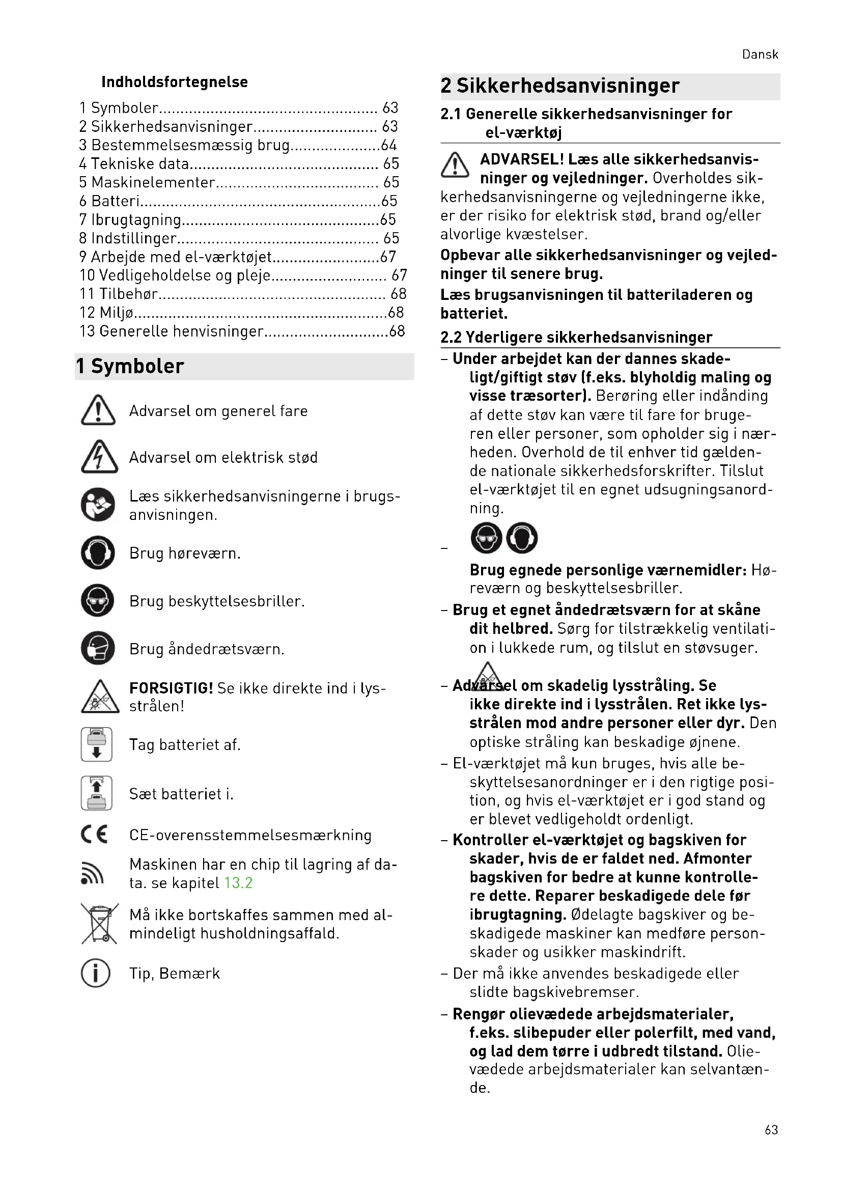 - 13 Generelle henvisninger 1 Symboler Advarsel om generel fare Advarsel om elektrisk stød Læs sikkerhedsanvisningerne i brugs anvisningen. Brug høreværn. Brug beskyttelsesbriller. Brug åndedrætsværn. FORSIGTIG! Se ikke direkte ind i lys strålen! Tag batteriet af. Sæt batteriet i. CE-overensstemmelsesmærkning Maskinen har en chip til lagring af da ta. se kapitel13.2 Må ikke bortskaffes sammen med al mindeligt husholdningsaffald. Tip, Bemærk 2 Sikkerhedsanvisninger p. 68