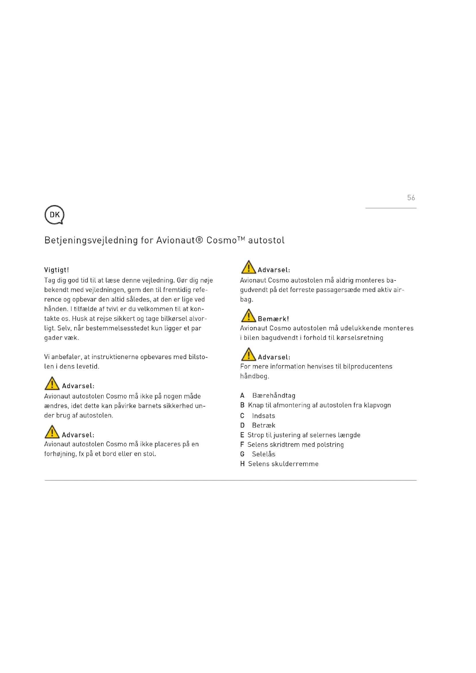 - Diese Garantie wurde von Ł.KARWALA, einem in Polen registrierten Unternehmen, erstellt. 54Die Adresse der Firma lautet: Szarlejka, ul. Lukaszewicza 172 42-130 Wreczyca Wielka, Polska (1) Gekaufte Produkte mit entfernten oder geänderten Etiketten oder Identifikationsnummern gelten als nicht autorisiert. Da die Echtheit solcher Produkte nicht nachgewiesen werden kann, erstreckt sich die Garantie nicht auf sie. 55Vigtigt! Tag dig god tid til at læse denne vejledning. Gør dig nøje bekendt med vejledningen, gem den til fremtidig refe- rence og opbevar den altid således, at den er lige ved hånden. I tilfælde af tvivl er du velkommen til at kon- takte os. Husk at rejse sikkert og tage bilkørsel alvor- ligt. Selv, når bestemmelsesstedet kun ligger et par gader væk. Vi anbefaler, at instruktionerne opbevares med bilsto- len i dens levetid. Advarsel: Avionaut autostolen Cosmo må ikke på nogen måde ændres, idet dette kan påvirke barnets sikkerhed un- der brug af autostolen. Advarsel: Avionaut autostolen Cosmo må ikke placeres på en forhøjning, fx på et bord eller en stol. Betjeningsvejledning for Avionaut® Cosmo™ autostol Advarsel: Avionaut Cosmo autostolen må aldrig monteres ba- gudvendt på det forreste passagersæde med aktiv air- bag. Bemærk! Avionaut Cosmo autostolen må udelukkende monteres i bilen bagudvendt i forhold til kørselsretning Advarsel: For mere information henvises til bilproducentens håndbog. A Bærehåndtag B Knap til afmontering af autostolen fra klapvogn C Indsats D Betræk E Strop til justering af selernes længde F Selens skridtrem med polstring G Selelås H Selens skulderremme