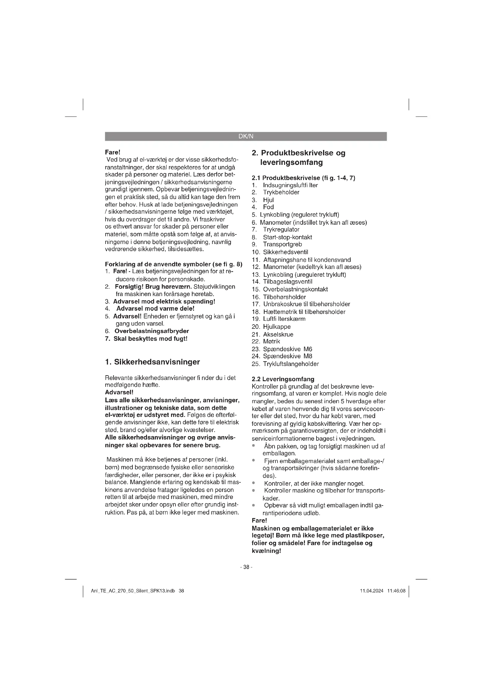 - Undersog Produktet for transportskader. I tilfaelde af skader skal speditionsfirmae, som har leveret kompressoren, omgaardene have besked.