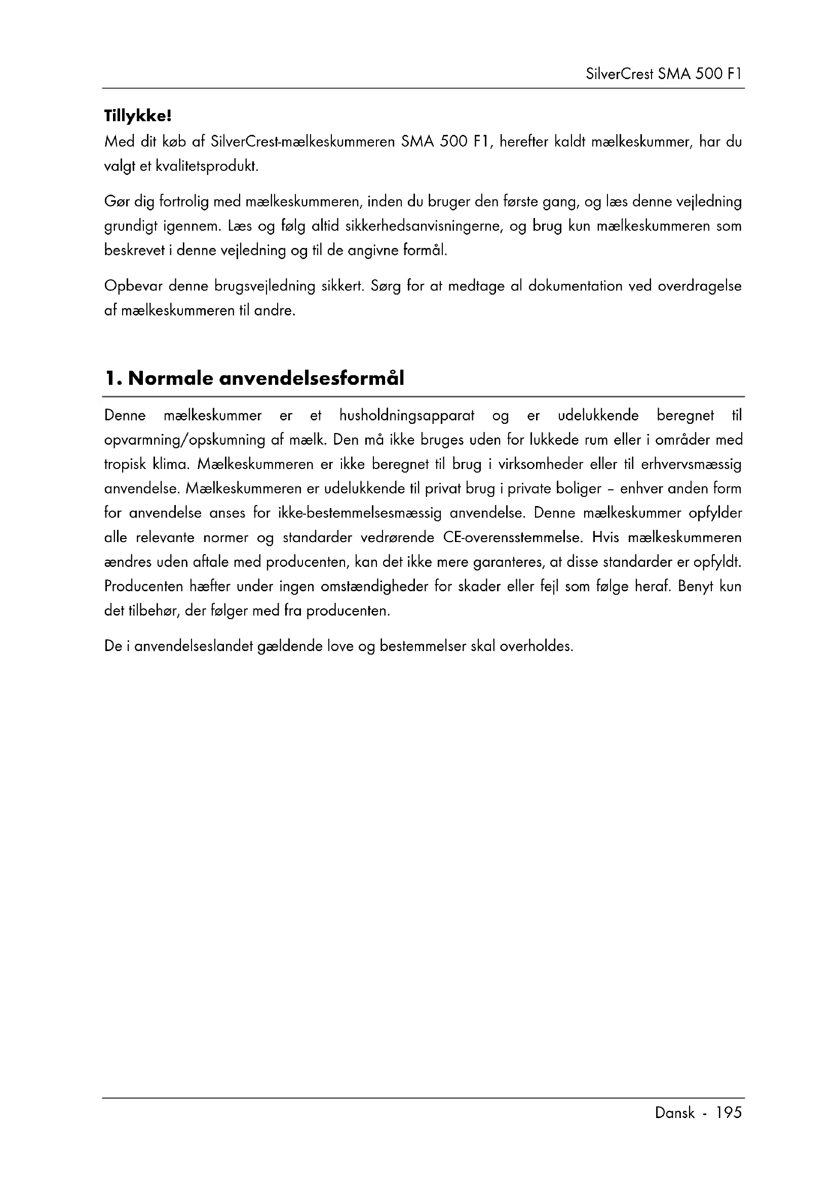Denne mælkeskummer er et husholdningsapparat og er udelukkende beregnet til opvarmning/opskumning af mælk. Den må ikke bruges uden for lukkede rum eller i områder med tropisk klima. Mælkeskummeren er ikke beregnet til brug i virksomheder eller til erhvervsmæssig anvendelse. Mælkeskummeren er udelukkende til privat brug i private boliger – enhver anden form for anvendelse anses for ikke-bestemmelsesmæssig anvendelse. Denne mælkeskummer opfylder alle relevante normer og standarder vedrørende CE-overensstemmelse. Hvis mælkeskummeren ændres uden aftale med producenten, kan det ikke mere garanteres, at disse standarder er opfyldt. Producenten hæfter under ingen omstændigheder for skader eller fejl som følge heraf. Benyt kun det tilbehør, der følger med fra producenten. De i anvendelseslandet gældende love og bestemmelser skal overholdes.SilverCrest SMA 500 F1