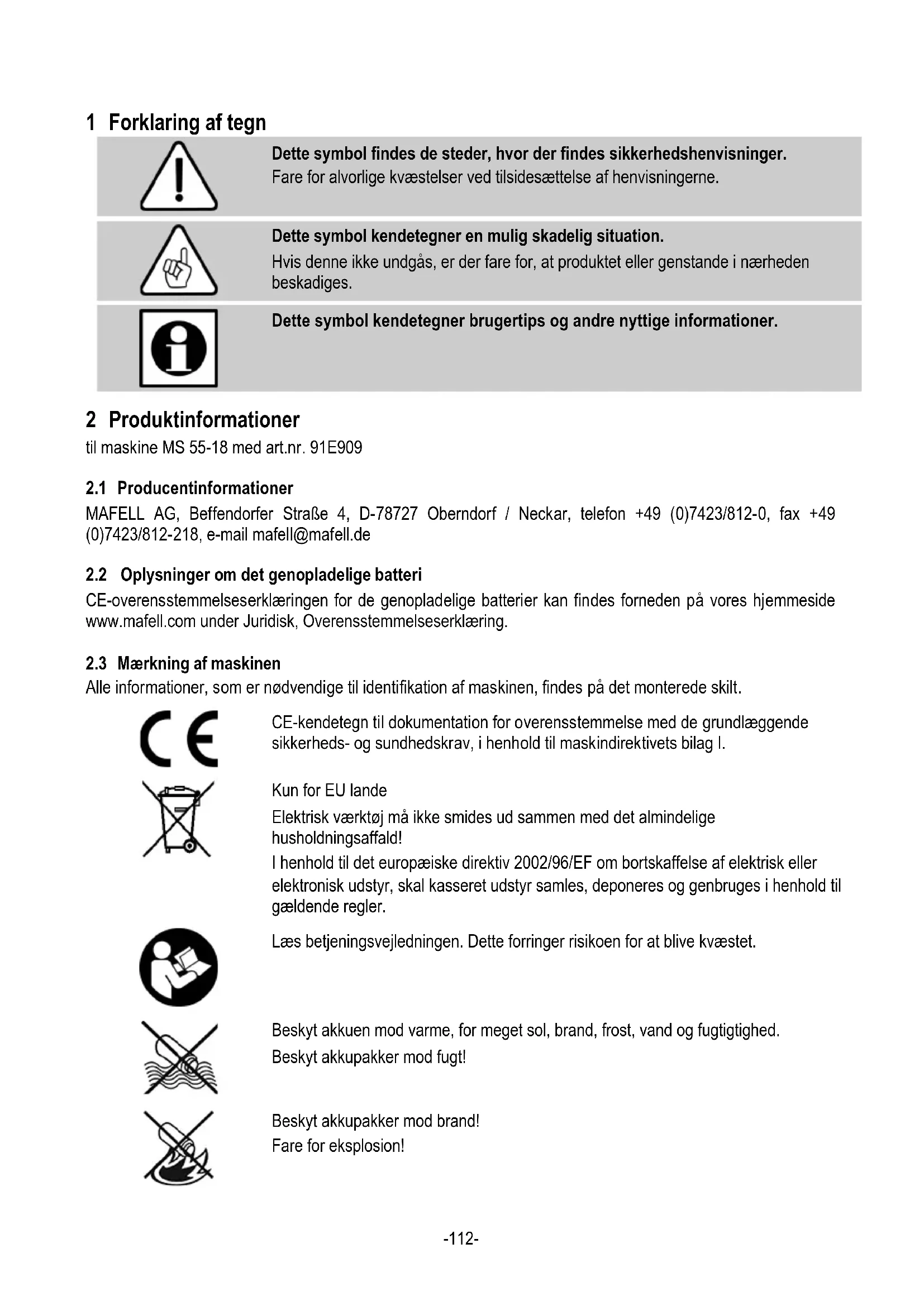CE-overensstemmelseserklæringen for de genopladelige batterier kan findes forneden på vores hjemmeside www.mafell.com under Juridisk, Overensstemmelseserklæring.