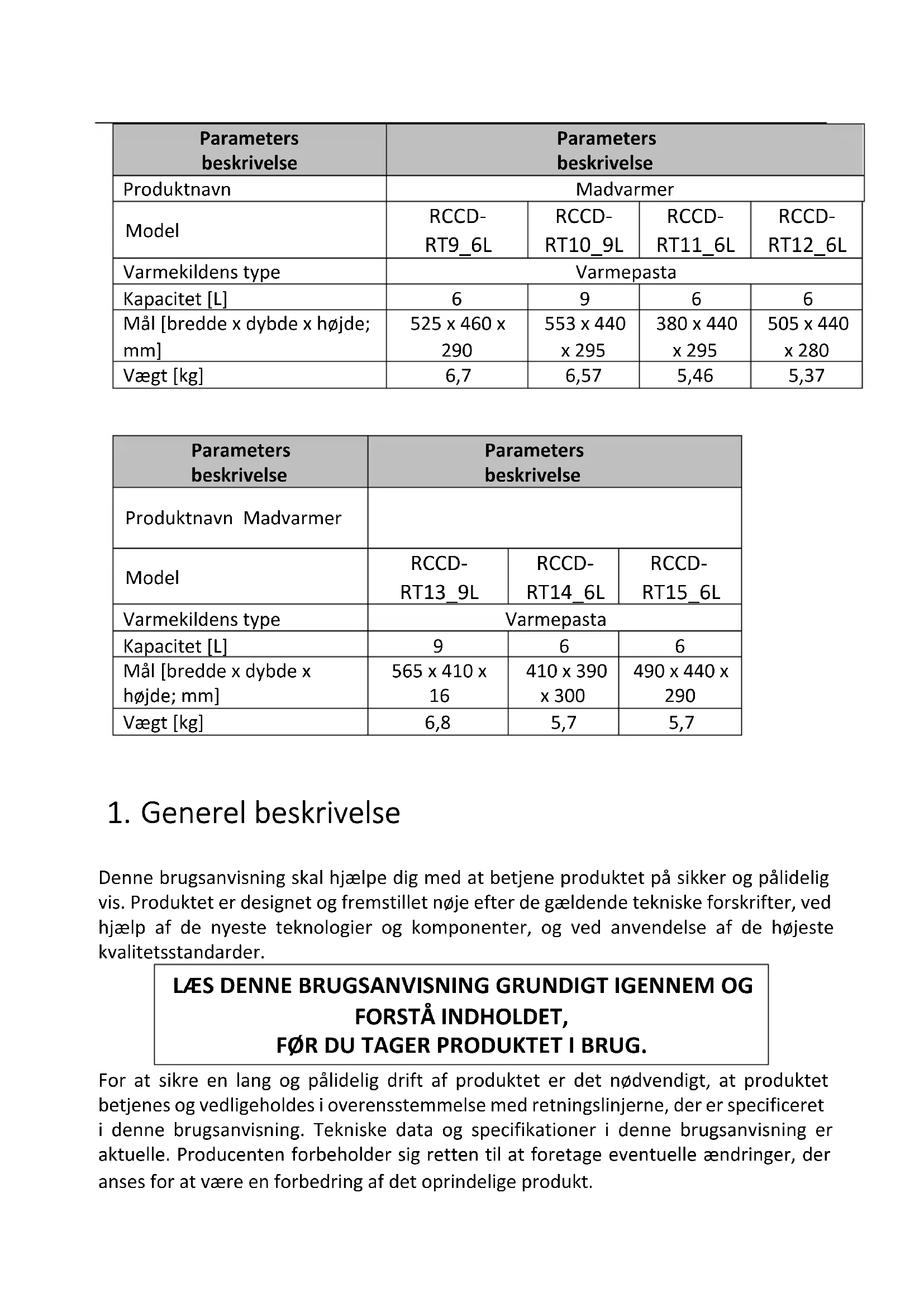 Produktet er beregnet til opvarmning af maden. Det holder også på varmen af maden placeret i produktet. Det er ikke beregnet til optøning eller tilberedning af frosne fødevarer. Enhver skade, der skyldes forkert brug, er brugerens ansvar. 3.1. Beskrivelse af produktet RCCD-RT1_9L