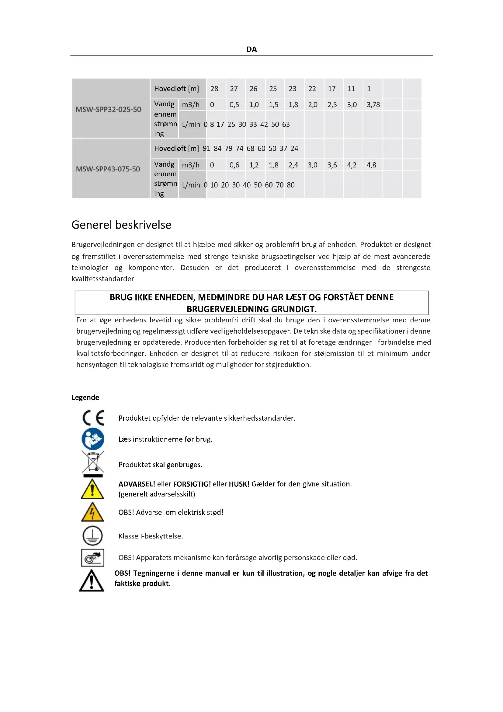 Udløb 1.25" Længde på strømkabel [m] 50DA Maks. vandgennemstrøm ning [m3/t] 3,78 6 3,78 3,78 4,8 Tabel over løftehøjde og vandgennemstrømning Hovedløft [m] 72 69 67 65 62 58 53 46 37 27 16 Vandg ennem strømn ing m3/h 0 0,6 1,2 1,8 2,4 3,0 3,6 4,2 4,8 5,4 6,0 L/min 0 10 20 30 40 50 60 70 80 90 100 Hovedløft [m] 43 42 40 39 37 35 32 27 22 16 9 Vandg ennem strømn ing m3/h 0 0,6 1,2 1,8 2,4 3,0 3,6 4,2 4,8 5,4 6,0 L/min 0 10 20 30 40 50 60 70 80 90 100 Hovedløft [m] 85 82 79 74 70 65 52 33 3 Vandg ennem strømn ing m3/h 0 0,5 1,0 1,5 1,8 2,0 2,5 3,0 3,78 L/min 0 8 17 25 30 33 42 50 63 Hovedløft [m] 54 52 51 48 45 43 37 32 22 12 Vandg ennem strømn ing m3/h 0 1,2 2,4 3,6 4,8 6,0 7,2 8,4 9,6 10,8 L/min 0 20 40 60 80 100 120 140 160 180 Hovedløft [m] 96 92 89 85 80 74 66 54 38 21 Vandg ennem strømn ing m3/h 0 1,2 2,4 3,6 4,8 6,0 7,2 8,4 9,6 10,8 L/min 0 20 40 60 80 100 120 140 160 180 Hovedløft [m] 60 58 56 52 49 46 37 23 3 Vandg ennem strømn ing m3/h 0 0,5 1,0 1,5 1,8 2,0 2,5 3,0 3,78 L/min 0 8 17 25 30 33 42 50 63 Hovedløft [m] 58 56 54 52 50 47 42 36 29 21 12 Vandg ennem strømn ing m3/h 0 0,6 1,2 1,8 2,4 3,0 3,6 4,2 4,8 5,4 6,0 L/min 0 10 20 30 40 50 60 70 80 90 100 Hovedløft [m] 39 37 36 34 32 30 24 15 2 Vandg ennem strømn ing m3/h 0 0,5 1,0 1,5 1,8 2,0 2,5 3,0 3,78 L/min 0 8 17 25 30 33 42 50 63DA Hovedløft [m] 28 27 26 25 23 22 17 11 1 Vandg ennem strømn ing m3/h 0 0,5 1,0 1,5 1,8 2,0 2,5 3,0 3,78 L/min 0 8 17 25 30 33 42 50 63 Hovedløft [m] 91 84 79 74 68 60 50 37 24 Vandg ennem strømn ing m3/h 0 0,6 1,2 1,8 2,4 3,0 3,6 4,2 4,8 L/min 0 10 20 30 40 50 60 70 80 Generel beskrivelse Brugervejledningen er designet til at hjælpe med sikker og problemfri brug af enheden. Produktet er designet og fremstillet i overensstemmelse med strenge tekniske brugsbetingelser ved hjælp af de mest avancerede teknologier og komponenter. Desuden er det produceret i overensstemmelse med de strengeste kvalitetsstandarder. BRUG IKKE ENHEDEN, MEDMINDRE DU HAR LÆST OG FORSTÅET DENNE BRUGERVEJLEDNING GRUNDIGT. For at øge enhedens levetid og sikre problemfri drift skal du bruge den i overensstemmelse med denne brugervejledning og regelmæssigt udføre vedligeholdelsesopgaver. De tekniske data og specifikationer i denne brugervejledning er opdaterede. Producenten forbeholder sig ret til at foretage ændringer i forbindelse med kvalitetsforbedringer. Enheden er designet til at reducere risikoen for støjemission til et minimum under hensyntagen til teknologiske fremskridt og muligheder for støjreduktion. Legende Produktet opfylder de relevante sikkerhedsstandarder. Læs instruktionerne før brug. Produktet skal genbruges. ADVARSEL! eller FORSIGTIG! eller HUSK! Gælder for den givne situation. (generelt advarselsskilt) OBS! Advarsel om elektrisk stød! Klasse I-beskyttelse. OBS! Apparatets mekanisme kan forårsage alvorlig personskade eller død. OBS! Tegningerne i denne manual er kun til illustration, og nogle detaljer kan afvige fra det faktiske produkt.DA Sikkerhed ved brug OBS! Læs alle sikkerhedsadvarsler og alle instruktioner. Manglende overholdelse af advarsler og instruktioner kan resultere i elektrisk stød, brand og/eller alvorlig personskade eller endda død. Udtrykkene "enhed" eller "produkt" bruges i advarslerne og instruktionerne til at henvise til: DYKPUMPE Elektrisk sikkerhed a) Stikket skal passe til stikkontakten. Du må ikke ændre stikket på nogen måde. Brug af originale stik og matchende stikkontakter reducerer risikoen for elektrisk stød. b) Brug altid strømkilder, der er forbundet til jorden og leverer den nødvendige spænding (angivet på etiketten på enheden). c) Undgå at røre ved jordforbundne elementer som rør, varmeapparater, kedler og køleskabe. Der er øget risiko for elektrisk stød, hvis den jordede enhed udsættes for regn, kommer i direkte kontakt med en våd overflade eller bruges i et fugtigt miljø. Vand, der trænger ind i apparatet, øger risikoen for skader på apparatet og for elektrisk stød. d) Rør ikke ved apparatet med våde eller fugtige hænder. e) Brug kun kablet til det formål, det er beregnet til. Brug den aldrig til at bære enheden eller til at trække stikket ud af en stikkontakt. Hold kablet væk fra varmekilder, olie, skarpe kanter eller bevægelige dele. Beskadigede eller sammenfiltrede kabler øger risikoen for elektrisk stød. f) Hvis du arbejder med enheden udendørs, skal du sørge for at bruge en forlængerledning, der er egnet til udendørs brug. Brug af en forlængerledning, der er egnet til udendørs brug, reducerer risikoen for elektrisk stød. g) Brug ikke enheden, hvis netledningen er beskadiget eller viser tydelige tegn på slitage. En beskadiget netledning skal udskiftes af en kvalificeret elektriker eller producentens servicecenter. h) Beskyt enheden mod solstråling. Brug enheden på et beskyttet sted for at undgå at beskadige udstyret eller bringe andre i fare.