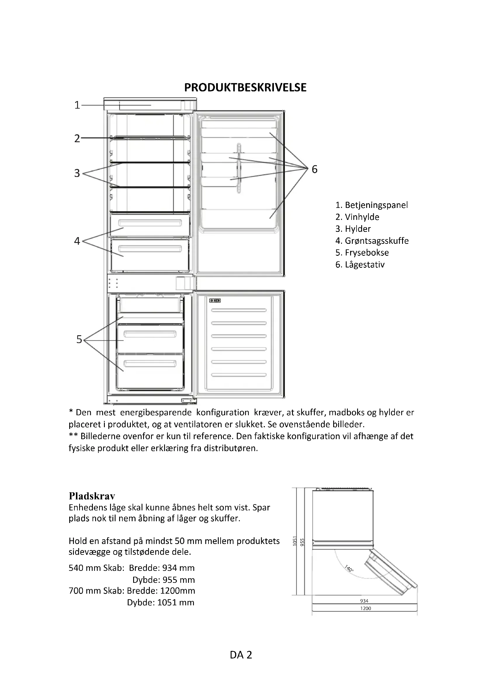 2PRODUKTBESKRIVELSE 1. Betjeningspanel2. Vinhylde3. Hylder4. Grøntsagsskuffe5. Frysebokse6. Lågestativ* Den mest energibesparende konfiguration kræver, at skuffer, madboks og hylder erplaceret i produktet, og at ventilatoren er slukket. Se ovenstående billeder.** Billederne ovenfor er kun til reference. Den faktiske konfiguration vil afhænge af detfysiske produkt eller erklæring fra distributøren.Pladskrav Enhedens låge skal kunne åbnes helt som vist. Spar plads nok til nem åbning af låger og skuffer. Hold en afstand på mindst 50 mm mellem produktets sidevægge og tilstødende dele.