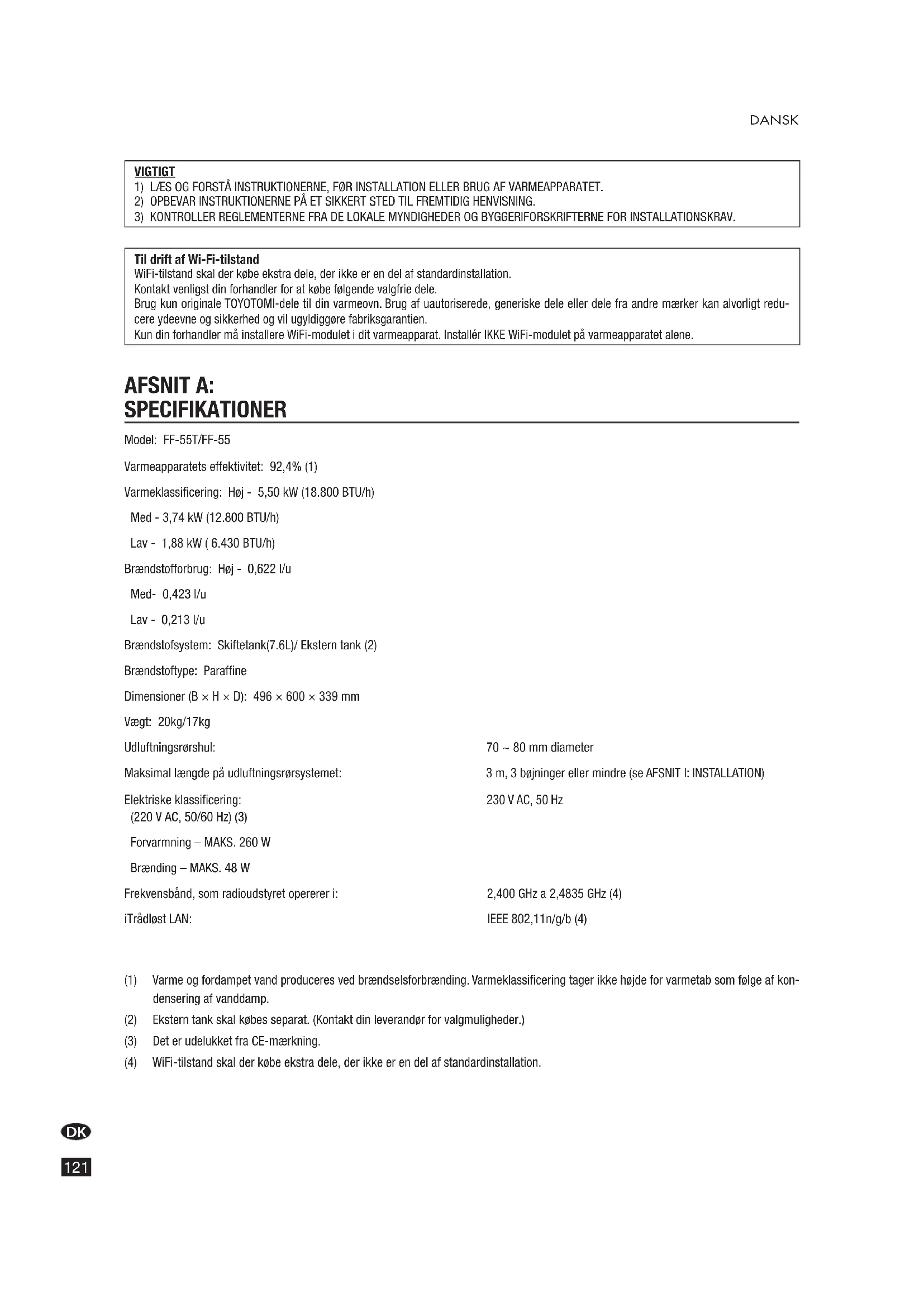 Til drift af Wi-Fi-tilstand WiFi-tilstand skal der købe ekstra dele, der ikke er en del af standardinstallation. Kontakt venligst din forhandler for at købe følgende valgfrie dele. Brug kun originale TOYOTOMI-dele til din varmeovn. Brug af uautoriserede, generiske dele eller dele fra andre mærker kan alvorligt redu- cere ydeevne og sikkerhed og vil ugyldiggøre fabriksgarantien. Kun din forhandler må installere WiFi-modulet i dit varmeapparat. Installér IKKE WiFi-modulet på varmeapparatet alene. AFSNIT A: SPECIFIKATIONER Model: FF-55T/FF-55 Varmeapparatets effektivitet: 92,4% (1) Varmeklassificering: Høj - 5,50 kW (18.800 BTU/h) Med - 3,74 kW (12.800 BTU/h) Lav - 1,88 kW ( 6.430 BTU/h) Brændstofforbrug: Høj - 0,622 l/u Med- 0,423 l/u Lav - 0,213 l/u Brændstofsystem: Skiftetank(7.6L)/ Ekstern tank (2) Brændstoftype: Paraffine Dimensioner (B × H × D): 496 × 600 × 339 mm Vægt: 20kg/17kg Udluftningsrørshul: 70 ~ 80 mm diameter Maksimal længde på udluftningsrørsystemet: 3 m, 3 bøjninger eller mindre (se AFSNIT I: INSTALLATION) Elektriske klassificering: 230 V AC, 50 Hz (220 V AC, 50/60 Hz) (3) Forvarmning – MAKS. 260 W Brænding – MAKS. 48 W Frekvensbånd, som radioudstyret opererer i: 2,400 GHz a 2,4835 GHz (4) iTrådløst LAN: IEEE 802,11n/g/b (4) (1) Varme og fordampet vand produceres ved brændselsforbrænding. Varmeklassificering tager ikke højde for varmetab som følge af kon- densering af vanddamp. (2) Ekstern tank skal købes separat. (Kontakt din leverandør for valgmuligheder.) (3) Det er udelukket fra CE-mærkning. (4) WiFi-tilstand skal der købe ekstra dele, der ikke er en del af standardinstallation.DK DANSK