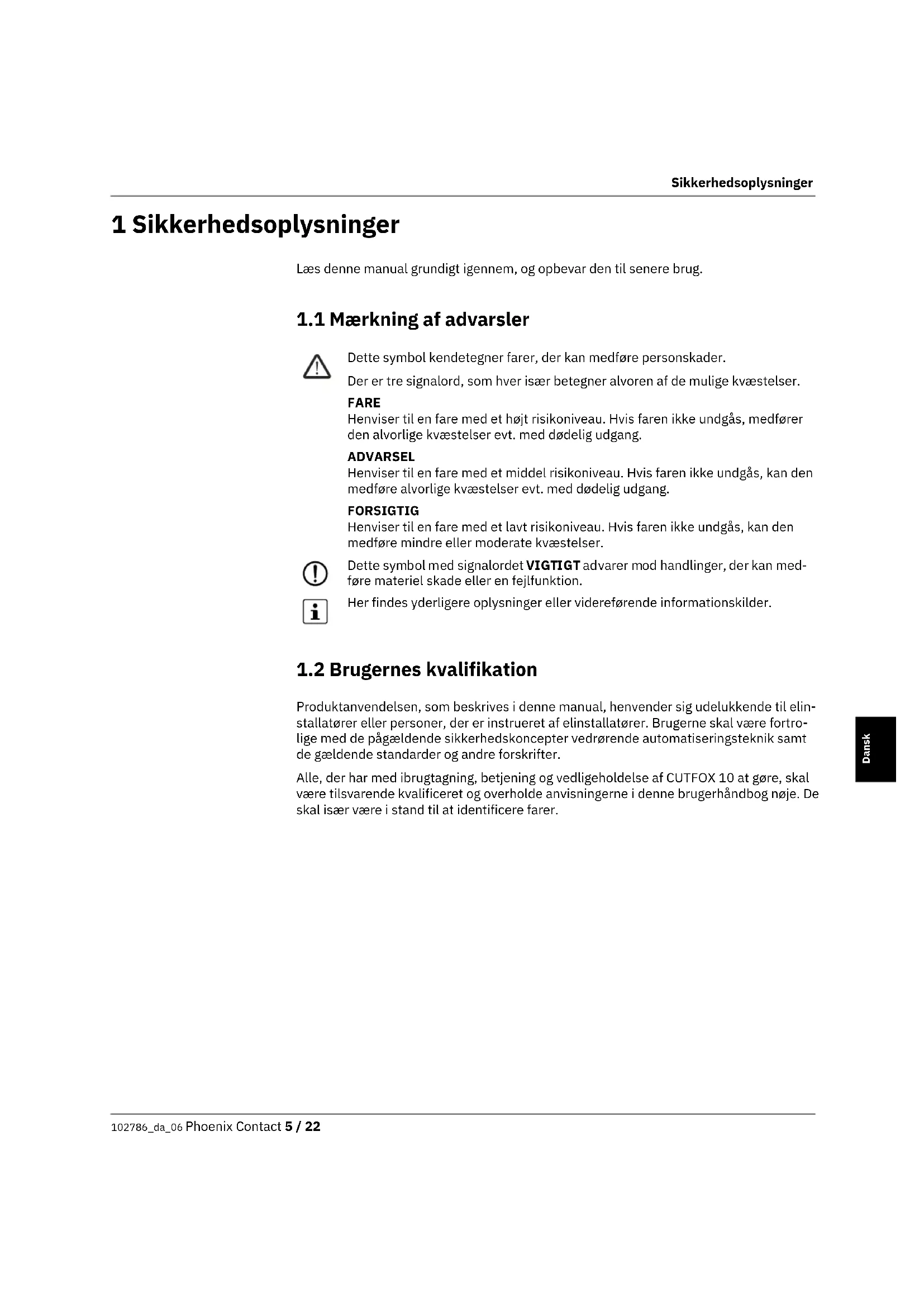 Produktanvendelsen, som beskrives i denne manual, henvender sig udelukkende til elin- stallatører eller personer, der er instrueret af elinstallatører. Brugerne skal være fortro- lige med de pågældende sikkerhedskoncepter vedrørende automatiseringsteknik samt de gældende standarder og andre forskrifter. Alle, der har med ibrugtagning, betjening og vedligeholdelse af CUTFOX 10 at gøre, skal være tilsvarende kvalificeret og overholde anvisningerne i denne brugerhåndbog nøje. De skal især være i stand til at identificere farer. Dette symbol kendetegner farer, der kan medføre personskader. Der er tre signalord, som hver især betegner alvoren af de mulige kvæstelser. FARE Henviser til en fare med et højt risikoniveau. Hvis faren ikke undgås, medfører den alvorlige kvæstelser evt. med dødelig udgang. ADVARSEL Henviser til en fare med et middel risikoniveau. Hvis faren ikke undgås, kan den medføre alvorlige kvæstelser evt. med dødelig udgang. FORSIGTIG Henviser til en fare med et lavt risikoniveau. Hvis faren ikke undgås, kan den medføre mindre eller moderate kvæstelser. Dette symbol med signalordet VIGTIGT advarer mod handlinger, der kan med- føre materiel skade eller en fejlfunktion. Her findes yderligere oplysninger eller videreførende informationskilder.CUTFOX 10 6 / 22 Phoenix Contact 102786_da_06