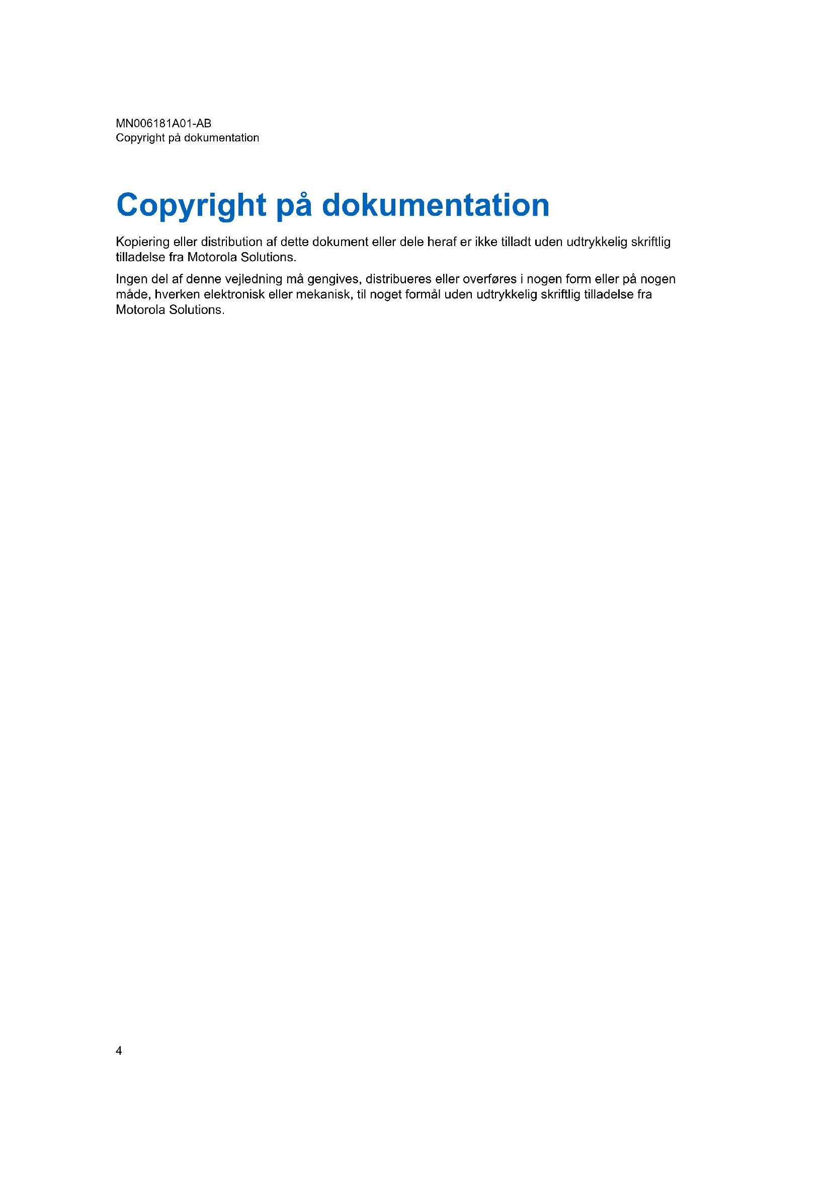 Kapitel 11: Tilbehør..................................................................................................48 MN006181A01-AB Indhold 3Copyright på dokumentation Kopiering eller distribution af dette dokument eller dele heraf er ikke tilladt uden udtrykkelig skriftlig tilladelse fra Motorola Solutions. Ingen del af denne vejledning må gengives, distribueres eller overføres i nogen form eller på nogen måde, hverken elektronisk eller mekanisk, til noget formål uden udtrykkelig skriftlig tilladelse fra Motorola Solutions. MN006181A01-AB Copyright på dokumentation 4Ansvarsfraskrivelse Oplysningerne i dette dokument gennemgås grundigt og anses for at være helt pålidelige. Der påtages dog intet ansvar for unøjagtigheder. Motorola Solutions forbeholder sig ret til at foretage ændringer af et hvilket som helst produkt heri for at forbedre pålideligheden, funktionen eller designet. Motorola Solutions påtager sig intet ansvar som følge af applikationer eller brug af produkter eller kredsløb, der er beskrevet heri, og dækker heller ingen licens under sine patentrettigheder eller andres rettigheder. MN006181A01-AB Ansvarsfraskrivelse 5Ophavsret på computersoftware De Motorola Solutions-produkter, som er beskrevet i denne vejledning, kan indeholde computerprogrammer, som Motorola Solutions har copyright på, og som er gemt i halvlederhukommelser eller på andre medier. Lovgivningen i USA og andre lande giver Motorola Solutions visse eksklusive rettigheder til computerprogrammer med ophavsret, inklusive, men ikke begrænset til, eneret til at kopiere eller reproducere computerprogrammer med ophavsret i nogen form. Følgelig må computerprogrammer, som Motorola Solutions har copyright på, og som er indeholdt i Motorola Solutions-produkter og beskrevet i denne manual, ikke kopieres, reproduceres, ændres, udsættes for reverse engineering eller distribueres på nogen måde uden udtrykkelig skriftlig tilladelse fra Motorola-Solutions. Derudover vil købet af Motorola Solutions-produkter ikke være genstand for overdragelse, hverken direkte eller indirekte, ved afskæring fra indsigelse eller på anden måde, af nogen licens i henhold til copyright, patenter eller patentprogrammer fra Motorola Solutions, ud over de almindelige, ikke- eksklusive licenser til brug, som opstår ud fra loven ved salg af produktet. MN006181A01-AB Ophavsret på computersoftware 6Sikkerhedsoplysninger om batterier, opladere og lydtilbehør Dette dokument indeholder vigtige sikkerheds- og betjeningsinstruktioner. Instruktionerne bør nærlæses og gemmes til senere brug. Inden brug af batteriopladeren bør du nærlæse alle instruktioner og advarselsmarkeringer på: