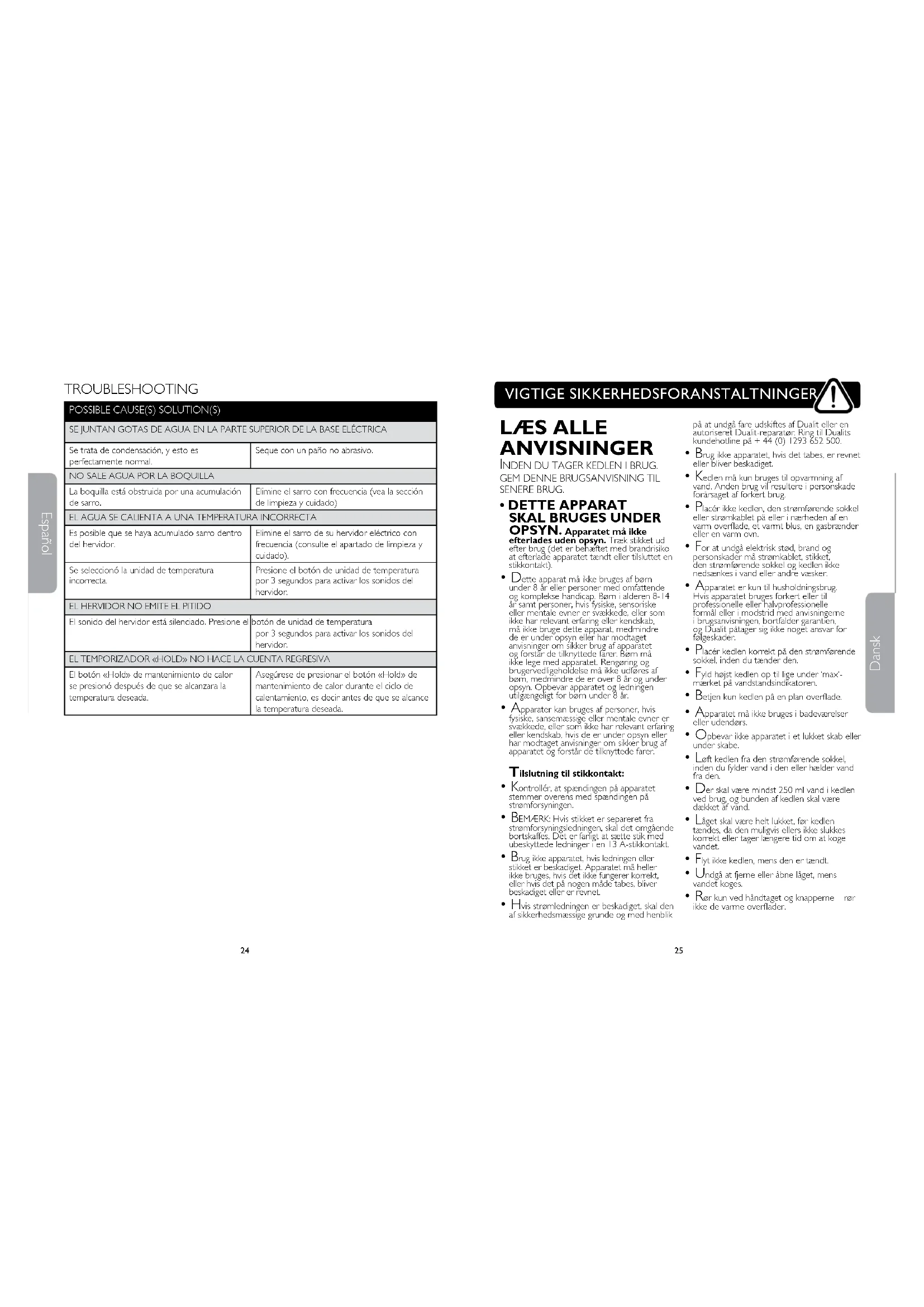 Nicht in einem Badezimmer oder im Freien benutzen. MULIG(E) ÅRSAG(ER) LØSNING(ER) DER KOMMER IKKE VAND UD AF TUDENTuden er blokeret af kalkophobning. Afkalk jævnligt (se rengøring og vedligeholdelse).DET OPVARMEDE VAND ER DEN FORKERTE TEMPERATURDer kan være kalkaejringer i kedlen. Afkalk din kedel jævnligt (se rengøring og vedligeholdelse).Der er valgt en forkert temperaturenhed. Tryk på temperaturenhedsknappen for at skifte mellem temperaturenheder.Skærmen viser den valgte enhed.KEDLEN BIPPER IKKEKedlens lyd er slået fra. Tryk på temperaturenhedsknappen, og hold den nede i 3 sekunder for at slå kedlens lyd til.TIMEREN TÆLLER IKKE NEDDer blev trykket på varmholdningsknappen, efter at måltemperaturen var nået.Sørg for at trykke på varmholdningsknappen under opvarmningscyklussen, inden måltemperaturen nås. FEJLFINDING WICHTIGE SICHERHEITSVORKEHRUNGEN3736 Deutsch Deutsch
