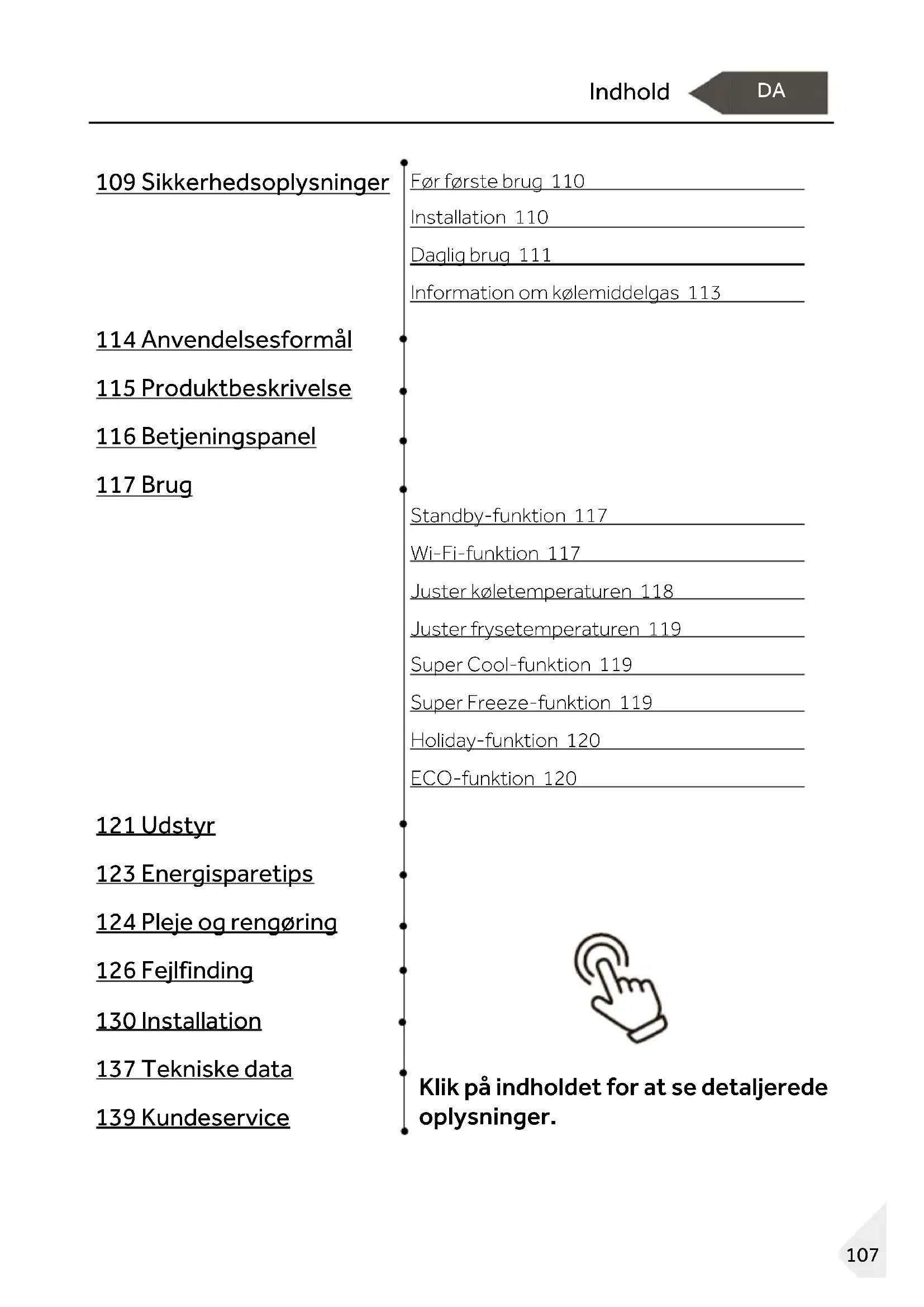 Indhold 109 Sikkerhedsoplysninger Før første brug 110 Installation 110 Daglig brug 111 Information om kølemiddelgas 113 114 Anvendelsesformål