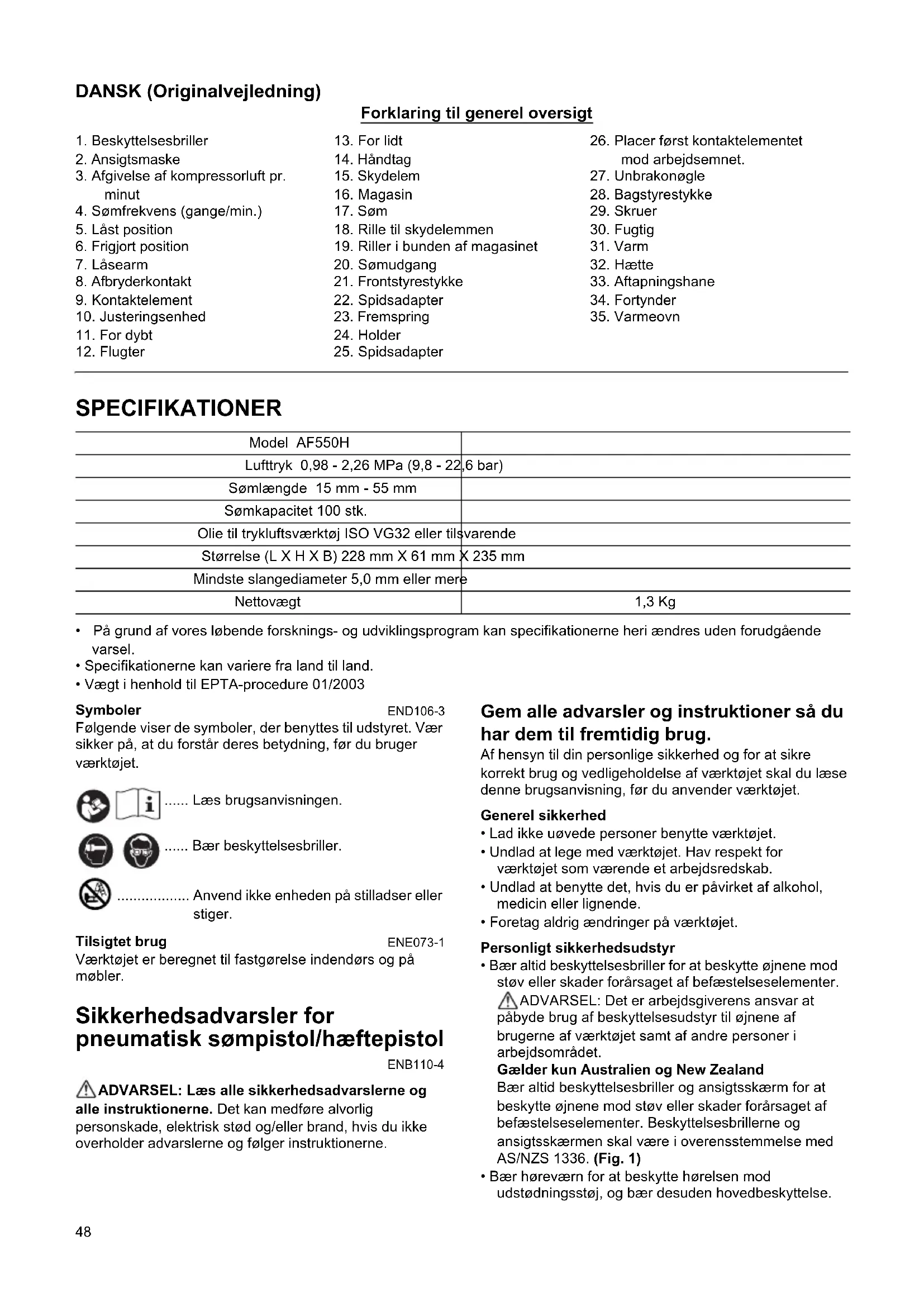 - Vægt i henhold til EPTA-procedure 01/2003 Symboler END106-3 Følgende viser de symboler, der benyttes til udstyret. Vær sikker på, at du forstår deres betydning, før du bruger værktøjet. ...... Læs brugsanvisningen. ...... Bær beskyttelsesbriller. .................. Anvend ikke enheden på stilladser eller stiger. Tilsigtet brug ENE073-1 Værktøjet er beregnet til fastgørelse indendørs og på møbler. Sikkerhedsadvarsler for pneumatisk sømpistol/hæftepistol ENB110-4 ADVARSEL: Læs alle sikkerhedsadvarslerne og alle instruktionerne. Det kan medføre alvorlig personskade, elektrisk stød og/eller brand, hvis du ikke overholder advarslerne og følger instruktionerne. Gem alle advarsler og instruktioner så du har dem til fremtidig brug. Af hensyn til din personlige sikkerhed og for at sikre korrekt brug og vedligeholdelse af værktøjet skal du læse denne brugsanvisning, før du anvender værktøjet. Generel sikkerhed