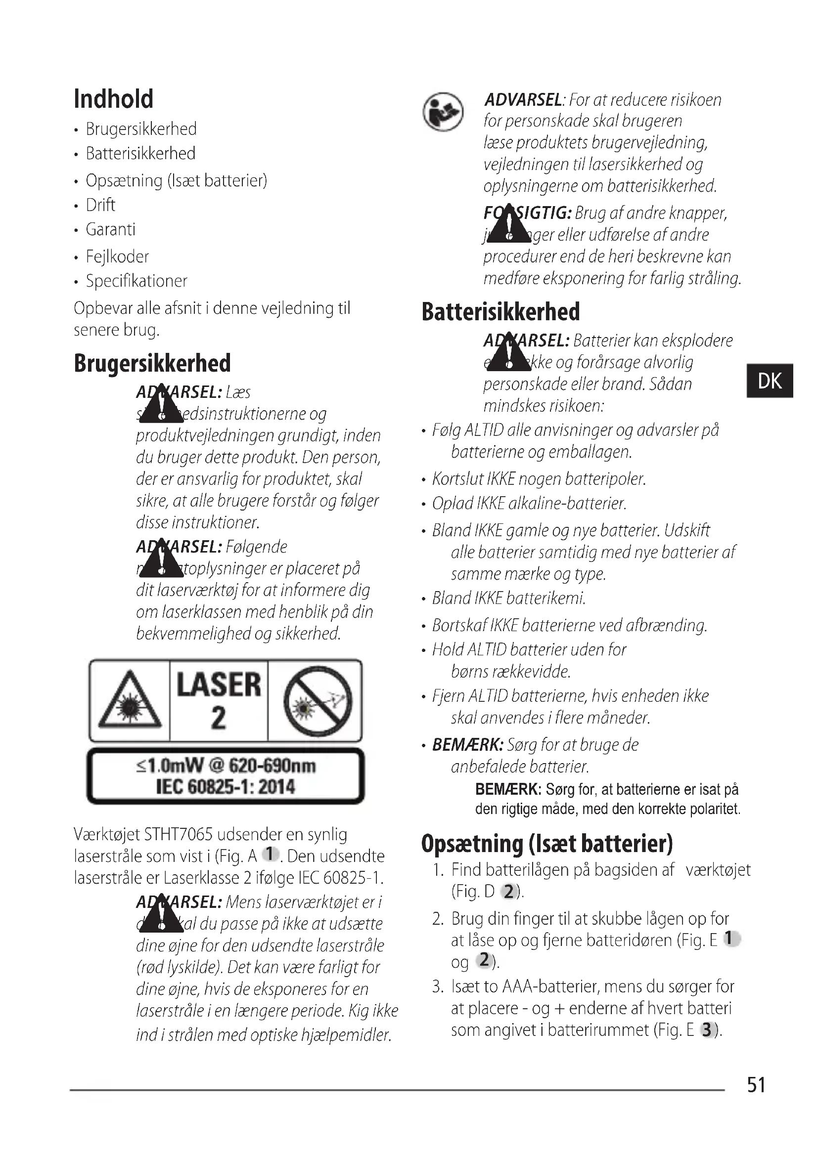 Værktøjet STHT7065 udsender en synlig laserstråle som vist i (Fig.A . Den udsendte laserstråle er Laserklasse 2ifølge IEC 60825-1. ADVARSEL: Mens laserværktøjet er i drift, skal du passe på ikke at udsætte dine øjne for den udsendte laserstråle (rød lyskilde). Det kan være farligt for dine øjne, hvis de eksponeres for en laserstråle i en længere periode. Kig ikke ind i strålen med optiskehjælpemidler. ADVARSEL: For at reducere risikoen for personskade skal brugeren læse produktets brugervejledning, vejledningen til lasersikkerhed og oplysningerne ombatterisikkerhed. FORSIGTIG: Brug af andre knapper, justeringer eller udførelse af andre procedurer end de heri beskrevne kan medføre eksponering for farligstråling. Batterisikkerhed