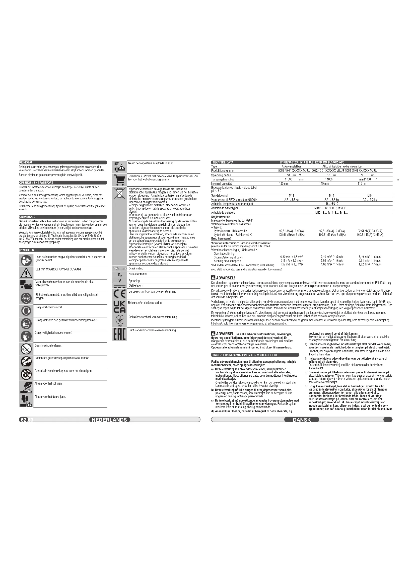 Fælles advarselshenvisninger til slibning, sandpapirslibning, arbejde med trådbørster, polering og skærearbejde: a) Dette elværktøj kan anvendes som sliber, sandpapirsliber, trådbørste og skæremaskine. Læs og overhold alle advarsler, instruktioner, illustrationer og data, som du modtager i forbindelse med elværktøjet. Overholder du ikke følgende instruktioner, kan du få elektrisk stød, der kan opstå brand og /eller du kan blive kvæstet alvorligt. b) Dette elværktøj må ikke bruges til arbejdsprocesser som f.eks. polering. Arbejdsprocesser, som værktøjet ikke er beregnet til, kan udgøre en fare og forårsage personskade. c) Dette elværktøj må udelukkende anvendes i overensstemmelse med formålet og i henhold til fabrikantens anvisninger. Forkert brug kan resultere i tab af kontrol og alvorlig personskade. d) Anvend kun tilbehør, hvis det er beregnet til dette elværktøj og godkendt og specifi ceret af fabrikanten. Selv om det er muligt at fastgøre tilbehøret til dit el-værktøj, er det ikke ensbetydende med garanti for sikker brug. e) Den tilladte hastighed for indsatsværktøjet skal mindst være så høj som den maksimale hastighed, der er angivet på elektroværktøjet. Tilbehør, der drejer hurtigere end tilladt, kan brække og de enkelte dele fl yve fra hinanden. f) Indsatsværktøjets udvendige diameter og tykkelse skal svare til målene på dit elværktøj. Forkert målt indsatsværktøj kan ikke afskærmes eller kontrolleres tilstrækkeligt. g) Dimensionerne på tilbehørsdelen skal passe til dimensionerne på elværktøjets adapter. Tilbehør, som ikke passer præcist til el-værktøjets adapter, roterer ujævnt, vibrerer voldsomt og kan medføre, at du mister kontrollen over værktøjet. h) Brug ikke el-værktøjet, hvis det er beskadiget. Kontrollér altid før brug indsatsværktøj som f.eks. slibeskiver for afsplintninger og revner, slibebagskiver for revner, slid eller stærkt slid, trådbørster for løse eller brækkede tråde. Tabes el-værktøjet eller indsatsværktøjet på jorden, skal du kontrollere, om det er beskadiget; anvend evt. et ubeskadiget indsatsværktøj. Når indsatsværktøjet er kontrolleret og indsat, skal du holde dig selv og personer, der befi nder sig i nærheden, uden for det niveau, hvor med ståltrådsbørste, kan andre vibrationsværdier forekomme! ADVARSEL! Det vibrations- og støjemissionsniveau, der nævnes i dette oplysningsskema, er blevet målt i overensstemmelse med en standardiseret test fra EN 62841, og det kan bruges til at sammenligne ét værktøj med et andet. Det kan bruges til en foreløbig bedømmelse af eksponeringen. Det erklærede vibrations- og støjemissionsniveau repræsenterer værktøjets primære anvendelsesformål. Det er dog sådan, at hvis værktøjet bruges til andre formål, med forskelligt tilbehør eller dårlig vedligeholdt, så kan vibrations- og støjemissionen variere. Det kan evt. øge eksponeringsniveauet markant i løbet af det samlede arbejdstidsrum. Ved slibning af tynde metalplader eller andre nemt vibrerende strukturer med en stor overfl ade, kan der opstå et væsentligt højere lydniveau (op til 15 dB) end angivet. Ved sådanne arbejdsemner anbefales det at træff e passende foranstaltninger til støjdæmpning, f.eks. i form af tunge, fl eksible dæmpningsmåtter. Der skal også tages højde for det øgede støjniveau, både i forbindelse med risikovurderingen af støjeksponering og ved valg af passende høreværn. En vurdering af eksponeringsniveauet ift. vibration og støj bør også tage hensyn til de tidspunkter, hvor værktøjet er slukket eller hvor det kører, men rent faktisk ikke udfører jobbet. Det kan evt. mindske eksponeringsniveauet markant i løbet af det samlede arbejdstidsrum. Identifi cér yderligere sikkerhedsforanstaltninger med henblik på at beskytte brugeren mod eff ekten af vibration og/eller støj, som fx: vedligehold værktøjet og tilbehøret, hold hænderne varme, organisering af arbejdsmønstre. Akku vinkelsliber Akku vinkelsliber Akku vinkelsliber DANSK REINIGING Reinig het elektrische gereedschap regelmatig om slijpresten en ander vuil te verwijderen. Vooral de ventilatiesleuven moeten altijd schoon worden gehouden. Schoon elektrisch gereedschap verhoogt de werkveiligheid.