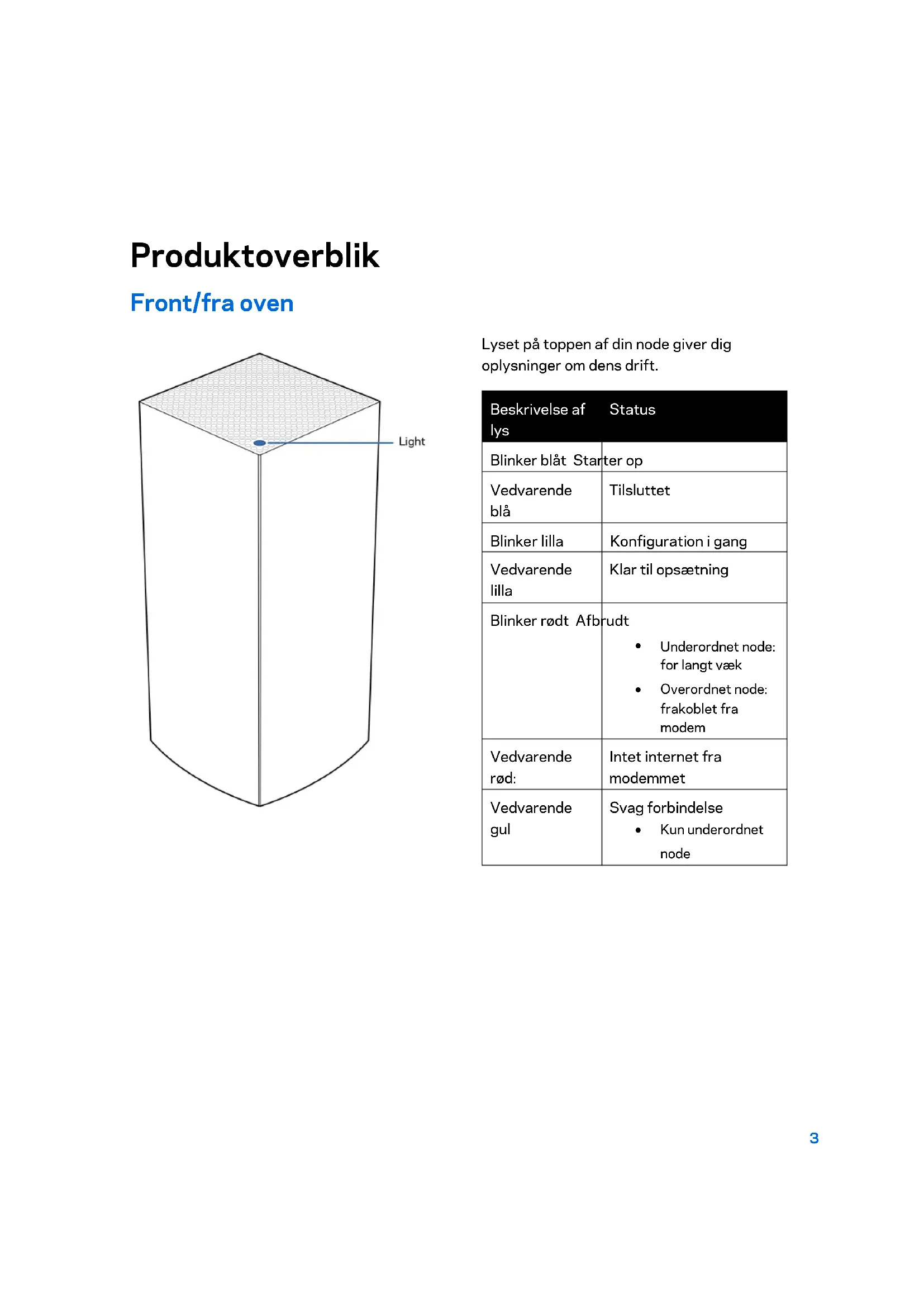 Nulstillingsknap—Tryk og hold nede, indtil lyset foran på noden bliver rødt, falmer og blinker rødt igen for at nulstille noden til dens fabriksindstillinger. Wi-Fi Protected Setup-knap–Tryk for at forbinde WPS-aktiverede netværksenheder. StrømknapFør til | (on) for at tænde routeren.6 Hjælp Hvor finder jeg mere hjælp?