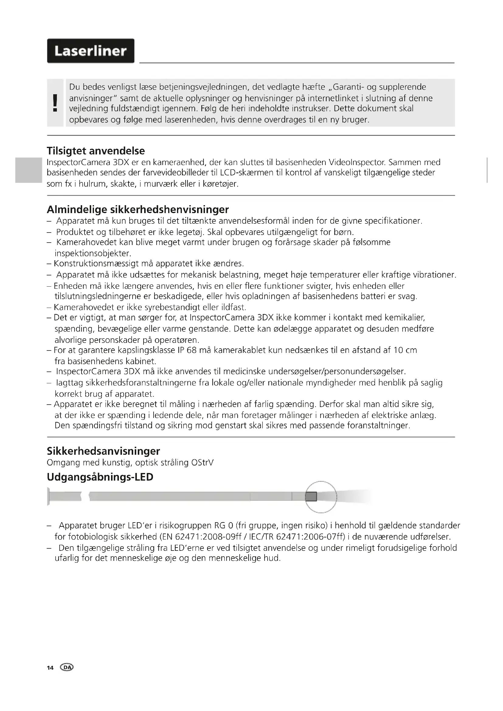 – Apparatet bruger LED‘er i risikogruppen RG 0 (fri gruppe, ingen risiko) i henhold til gældende standarder for fotobiologisk sikkerhed (EN 62471:2008-09ff / IEC/TR 62471:2006-07ff) i de nuværende udførelser. – Den tilgængelige stråling fra LED‘erne er ved tilsigtet anvendelse og under rimeligt forudsigelige forhold ufarlig for det menneskelige øje og den menneskelige hud. Udgangsåbnings-LED Sikkerhedsanvisninger Omgang med kunstig, optisk stråling OStrV Almindelige sikkerhedshenvisninger – Apparatet må kun bruges til det tiltænkte anvendelsesformål inden for de givne specikationer. – Produktet og tilbehøret er ikke legetøj. Skal opbevares utilgængeligt for børn. – Kamerahovedet kan blive meget varmt under brugen og forårsage skader på følsomme inspektionsobjekter. – Konstruktionsmæssigt må apparatet ikke ændres. – Apparatet må ikke udsættes for mekanisk belastning, meget høje temperaturer eller kraftige vibrationer. – Enheden må ikke længere anvendes, hvis en eller ere funktioner svigter, hvis enheden eller tilslutningsledningerne er beskadigede, eller hvis opladningen af basisenhedens batteri er svag. – Kamerahovedet er ikke syrebestandigt eller ildfast. – Det er vigtigt, at man sørger for, at InspectorCamera 3DX ikke kommer i kontakt med kemikalier, spænding, bevægelige eller varme genstande. Dette kan ødelægge apparatet og desuden medføre alvorlige personskader på operatøren. – For at garantere kapslingsklasse IP 68 må kamerakablet kun nedsænkes til en afstand af 10 cm fra basisenhedens kabinet. – InspectorCamera 3DX må ikke anvendes til medicinske undersøgelser/personundersøgelser. – Iagttag sikkerhedsforanstaltningerne fra lokale og/eller nationale myndigheder med henblik på saglig korrekt brug af apparatet. – Apparatet er ikke beregnet til måling i nærheden af farlig spænding. Derfor skal man altid sikre sig, at der ikke er spænding i ledende dele, når man foretager målinger i nærheden af elektriske anlæg. Den spændingsfri tilstand og sikring mod genstart skal sikres med passende foranstaltninger. Tilsigtet anvendelse InspectorCamera 3DX er en kameraenhed, der kan sluttes til basisenheden VideoInspector. Sammen med basisenheden sendes der farvevideobilleder til LCD-skærmen til kontrol af vanskeligt tilgængelige steder som fx i hulrum, skakte, i murværk eller i køretøjer. Du bedes venligst læse betjeningsvejledningen, det vedlagte hæfte „Garanti- og supplerende anvisninger“ samt de aktuelle oplysninger og henvisninger på internetlinket i slutning af denne vejledning fuldstændigt igennem. Følg de heri indeholdte instrukser. Dette dokument skal opbevares og følge med laserenheden, hvis denne overdrages til en ny bruger. !InspectorCamera 3DX