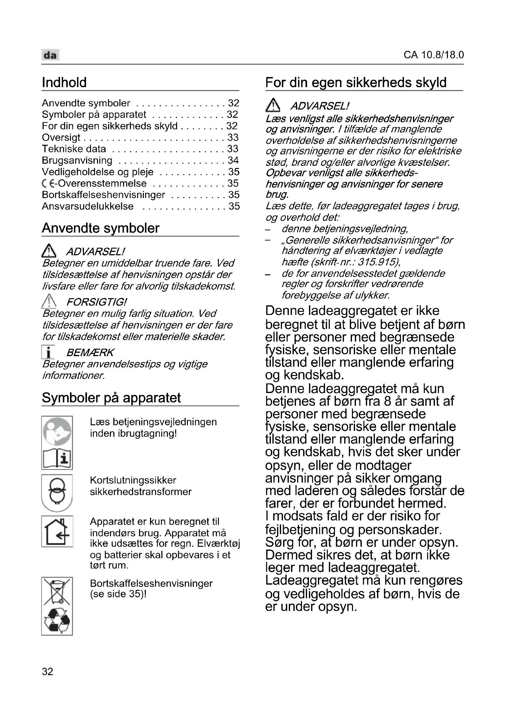 de for anvendelsesstedet gældende regler og forskrifter vedrørende forebyggelse af ulykker. Denne ladeaggregatet er ikke beregnet til at blive betjent af børn eller personer med begrænsede fysiske, sensoriske eller mentale tilstand eller manglende erfaring og kendskab. Denne ladeaggregatet må kun betjenes af børn fra 8 år samt af personer med begrænsede fysiske, sensoriske eller mentale tilstand eller manglende erfaring og kendskab, hvis det sker under opsyn, eller de modtager anvisninger på sikker omgang med laderen og således forstår de farer, der er forbundet hermed. I modsats fald er der risiko for fejlbetjening og personskader. Sørg for, at børn er under opsyn. Dermed sikres det, at børn ikke leger med ladeaggregatet. Ladeaggregatet må kun rengøres og vedligeholdes af børn, hvis de er under opsyn.CA 10.8/18.0